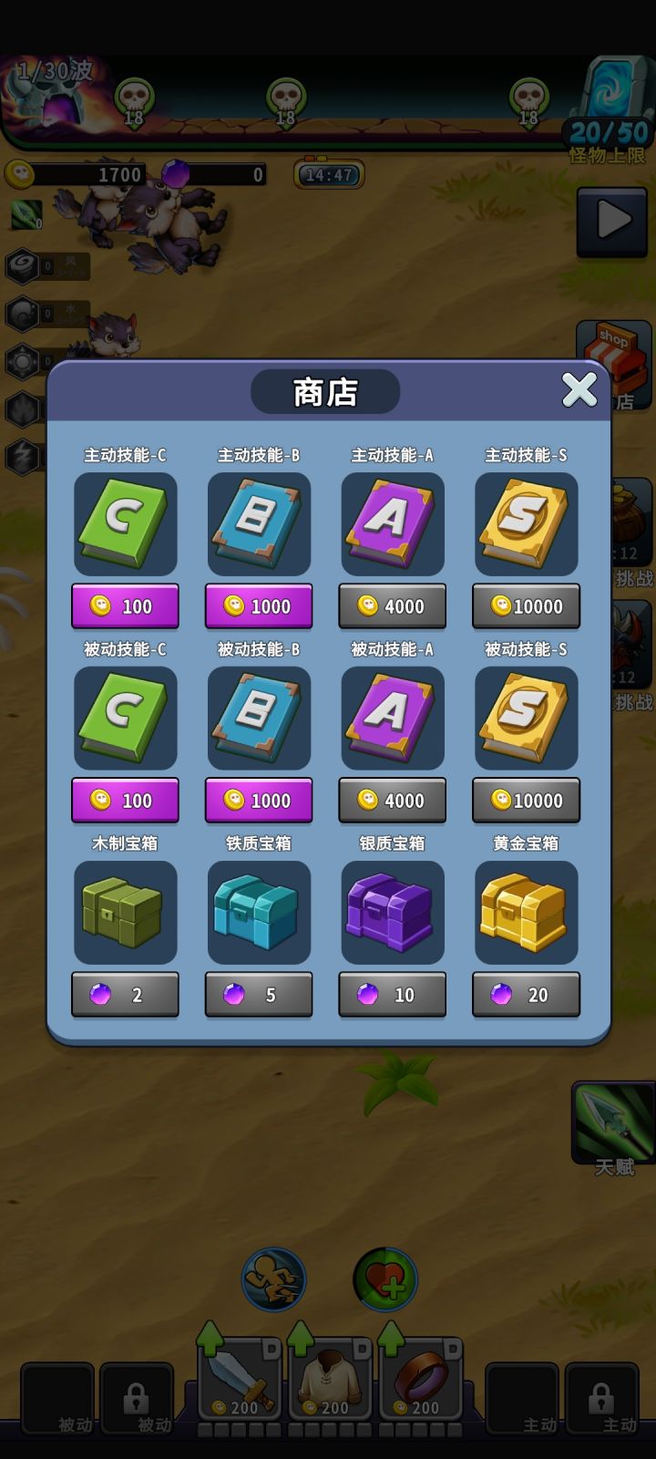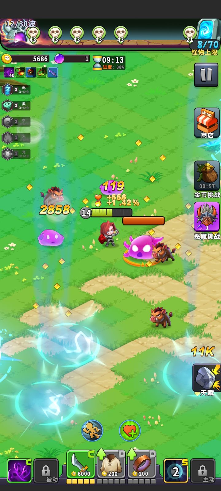 1、开局先买个100金币的主动技能和被动技能2、然后优先升级武器到绿色,然后是衣服和戒指。3、宝石满2个,就去买宝物,先买满5个宝物格子。再去攒更多的宝石,买高级宝物箱子,开高级宝物,进行替换。4、技能清不动怪物时,就换一个高级技能。5、拿BOSS奖励和宝物时,注意元素羁绊,尽量拿能凑齐3、6、9个,会有元素技能伤害。6、第一只恶魔龙,最好在武器升到蓝色时,再召唤。保险点的,三个装备都升