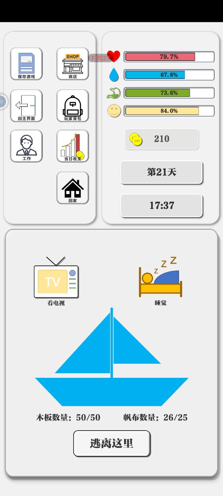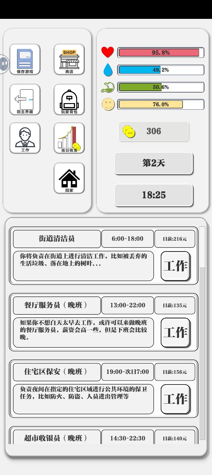 不足:1.感觉现在就是纯耗时间,工作进度一个字一个字蹦,睡觉从秒数开始转,实际操作时间还没有挂机时间长(这个帖子就是在挂机时间写的)2.玩法简单机械,可以加些随机事件bug:1.背包里的物品在使用一格后下一格会自动变暗但不是选中状态(刚打开背包时也有一个),所以连续使用需要先取消再选中(中间弹窗还会遮住使用按钮,更耗时间了)2.在背包全满状态买不了帆布木板,但实际帆布木板并不占背包格数攻略