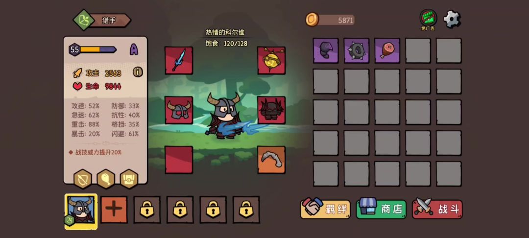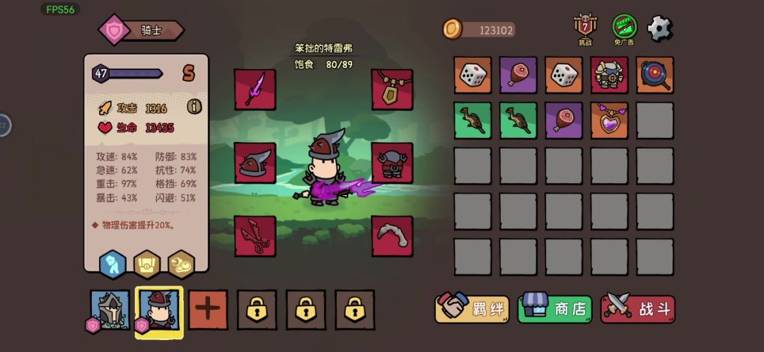 英雄用 骑士/战士 属性 重击=格挡>庇护 a或者b 均可 武器 屠龙>光铸剑 项链 回血 宝物 蘑菇 锅 防具 高格挡 平衡重击 独狼即可 不吃天赋不吃被动 前面靠武器和回血项链 肉过去 出了锅就乱杀了 食物存着 后面卖更值钱 紫色血量食物看被动出不出素食双倍 再吃 商店有钱就直接升 刷新点免费的 如果卡了 顶多赌个几下 血量高就乱杀 血战项链不如回血项链配锅 如果出了回血宝物 配合血战项链