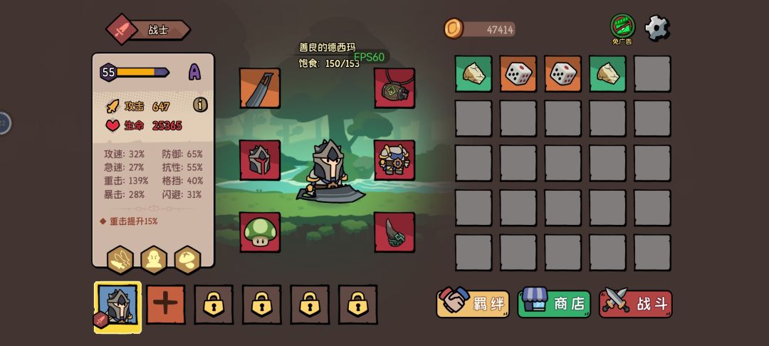 开局刷好的初始角色,重击血量为佳,然后装备主要血斩,其他随意,宝物有蘑菇就行,开局可以不升装备先把装备D的差不多了再升级商店。一般达到45关或者50关之前,只有一个或两个主c,打到最后几关,再买人口凑羁绊。#游戏种草计划#攻略