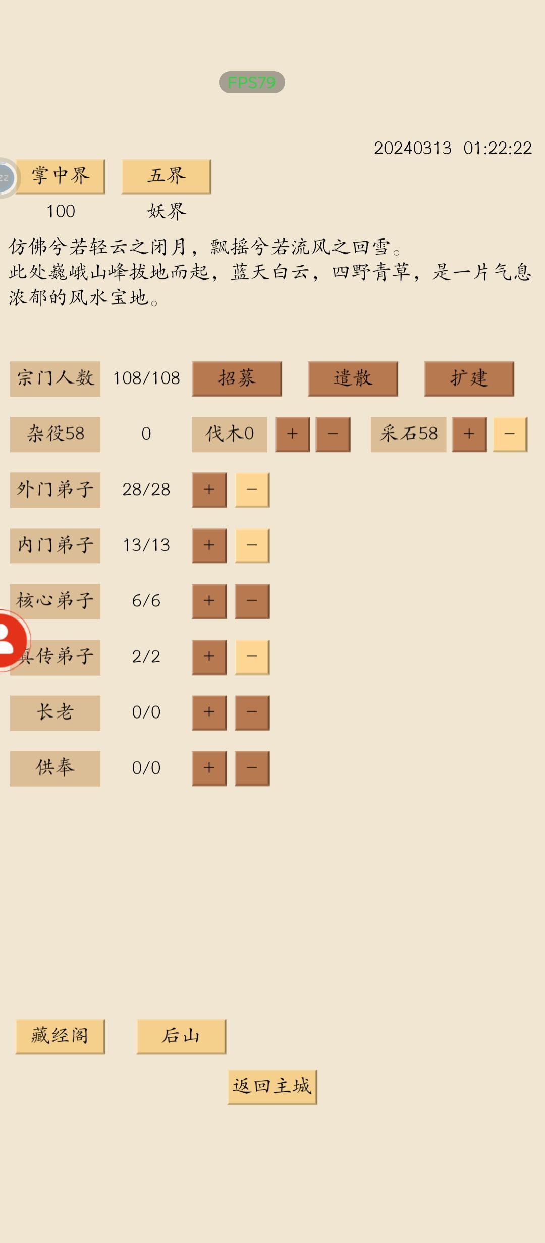 本来是要庆祝宗门108将的。没想到看到烟雨发的帖子,法宝的资源生产效率。是我没仔细看,这里再次道歉。 第三图呢是我升级法宝,大致分配点。也的确如我所说,占用了大量的生产。精华的生产取消了,粮食产量从2200降到1400,木头和石头都有所下降。这种分点还是妥协后的,全力生产的话木头石头降的更多。 如何取舍,建议优先宗门升到一定等级。原因还是宗门投的是生产效率,并且一次投入多资源产出。