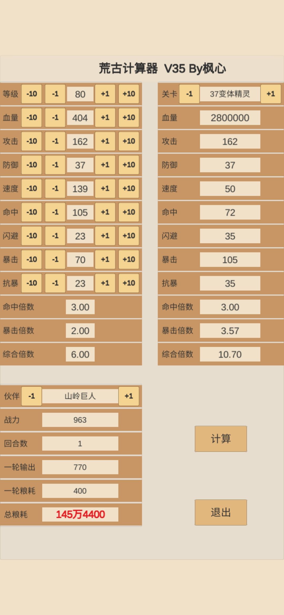 解锁炼金后,装备里面升级闪避(鞋)、抗暴(帽)、防御(衣)的三件不用管,属性不要超过35,防御之前要是超了也就超了多费一点点粮食。暴击70,命中105,这样正好是对面的两倍三倍这样有输出。多余的属性点给速度和攻击来提升输出;去掉血量,属性战力在550左右打粮食能省一点。再低也能打。高了更好。