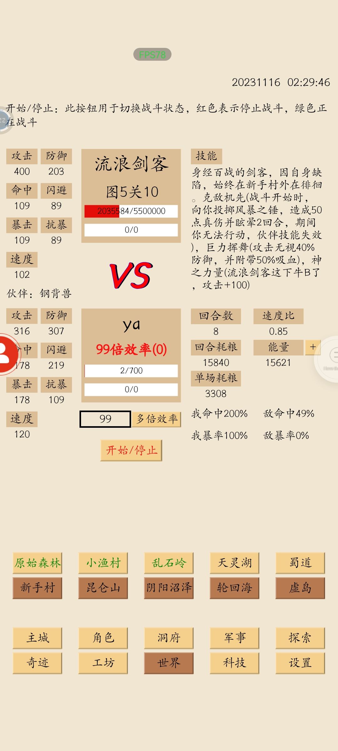730多万粮,我血量比较高,所以加了六十多点防御多抗一次伤害,其实加防御很亏,没办法,加到闪避上效果也不明显。 总的来说,打流浪剑客属性没有必要像我这么高,命中暴击178,闪避两倍以上,再适当加点闪避,其他属性加攻击和速度就行了