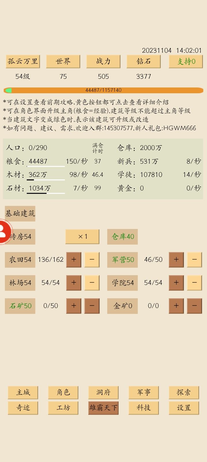 11.29 清完图五,开始规划之后的发展,等级依然是最优先项,朝着120级稳步推进。洞府开始提升有点慢,不急。军事招完钢背流浪继续平均升级兵种。科技先搞30采石,接下来一段时间内石需求会比较大,然后50农耕,不然120级改房子后岗位会不够。主城方面,房子先上100,农田等120级再补。 12.2 农耕40了,科技方面,把军训,安置,伐木补到30。等级117了,把晶石停了囤石头准备12改房子,顺便减