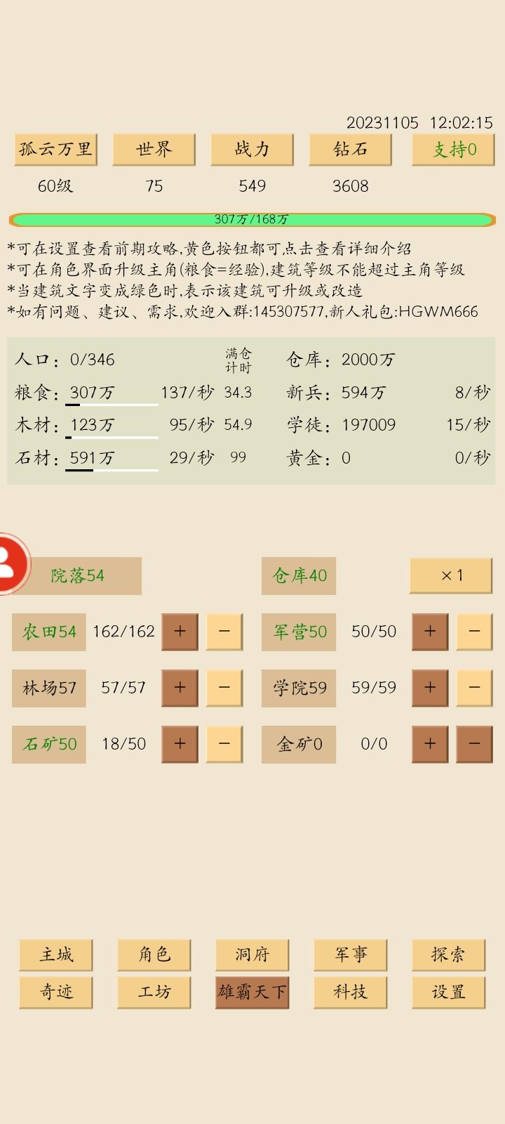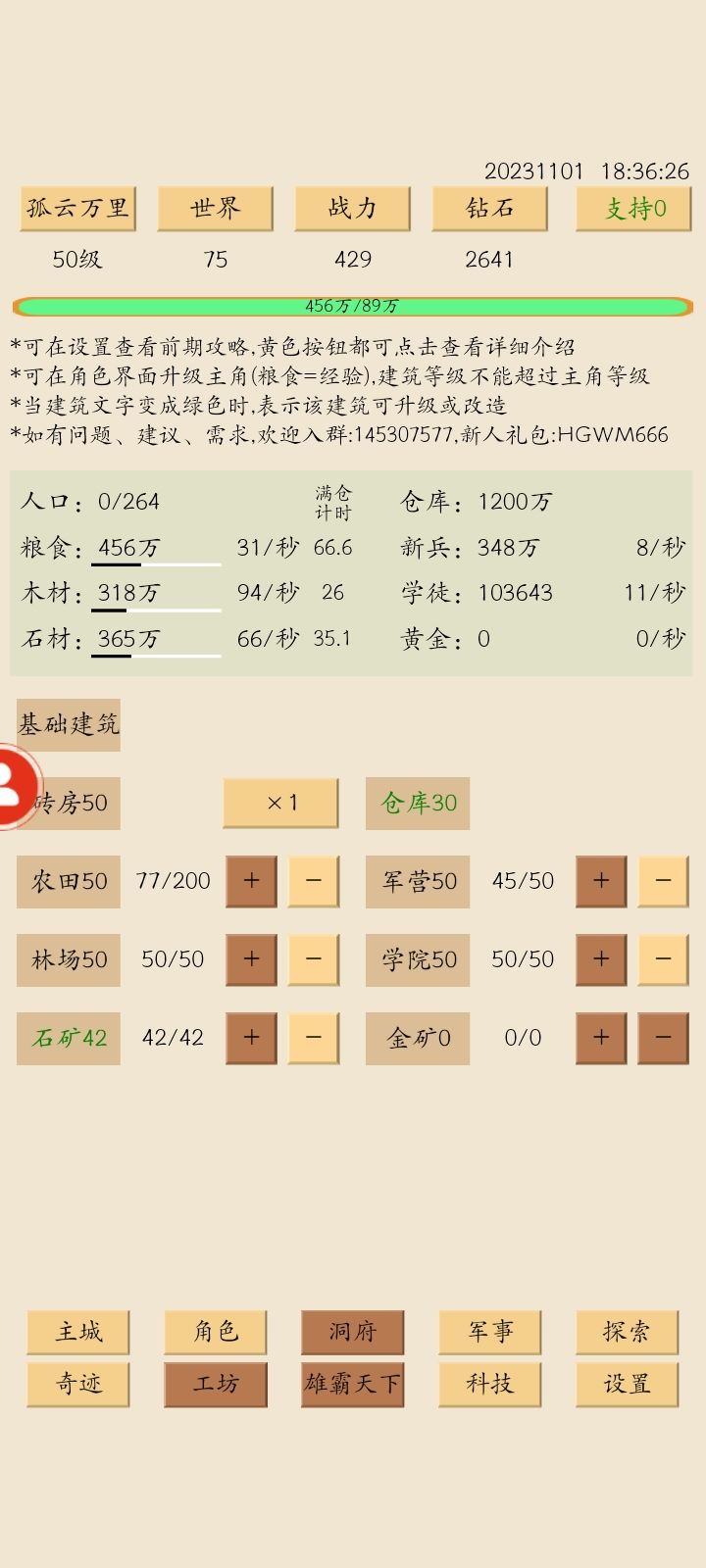 开了个新号,持续记录成长,新手可以照抄作业,少走弯路10月23日建号,第一天1、升6民居,6田,6木,把人物和仓库都升到11级,此时有1.5倍世界等级加成,资源尽量安排偶数工人,领礼包注意一定不要先领第一个,礼包顺序:报错补偿1011、报错补偿02、HGWM666。2、领了礼包,人物升到35级,仓库21级,木头20,石头10,房子拉满,改造,产出1万石头够200万再改造,然后打野鸡,出7级兵