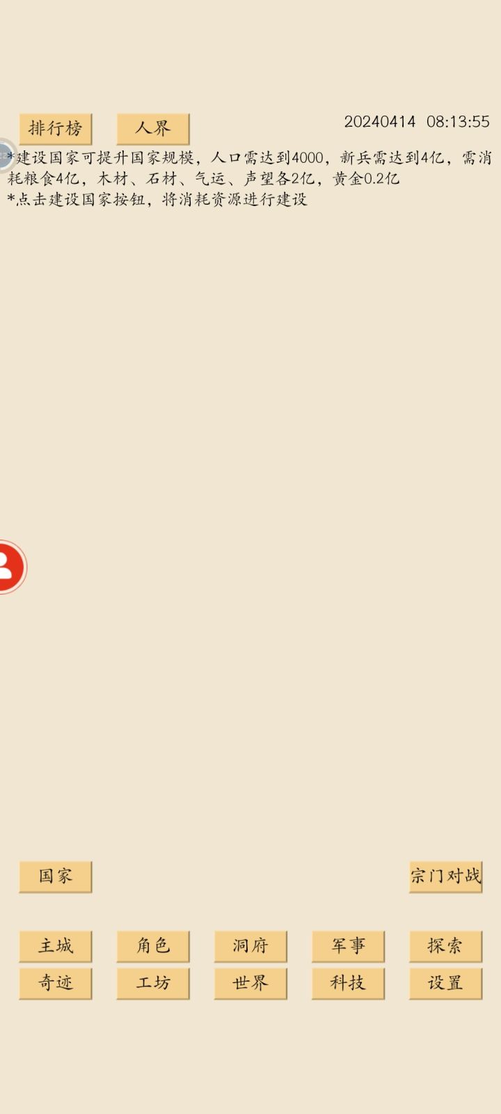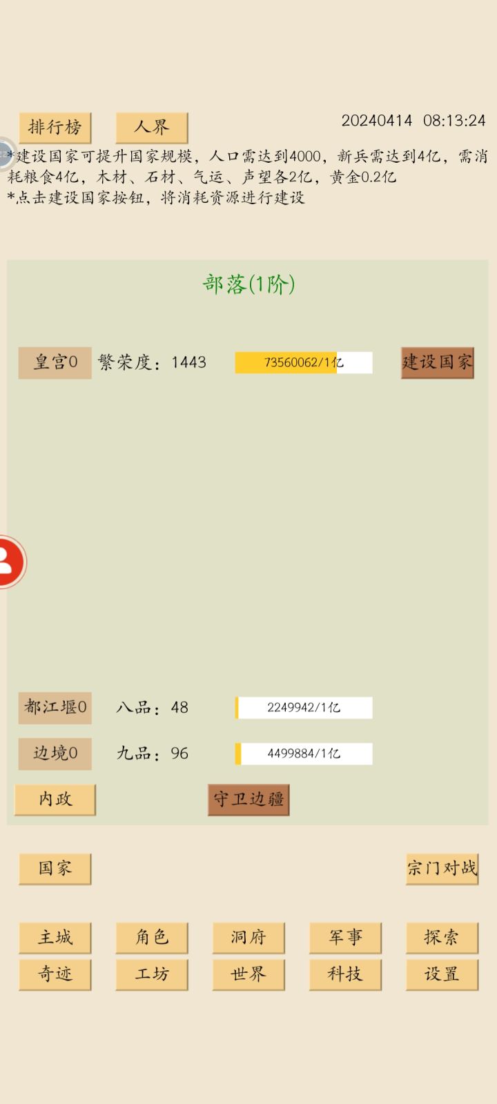 所有建设前提:国家升一级!需要的东西不多!人口道先需要到2000人!通关卡尔!粮食:20000万,木材:10000万,石材:10000万,气运:10000万,声望:10000万,黄金:1000万。由于气运是刚出建筑,所以一般正常来说只要升一升宗庙到60级基本上都存够了!也就是说大家都已开通国家一级了!国家二级需要的东西有点多,也只有排行榜上面的人才有闲钱升到二级以上。。。毕竟二级需