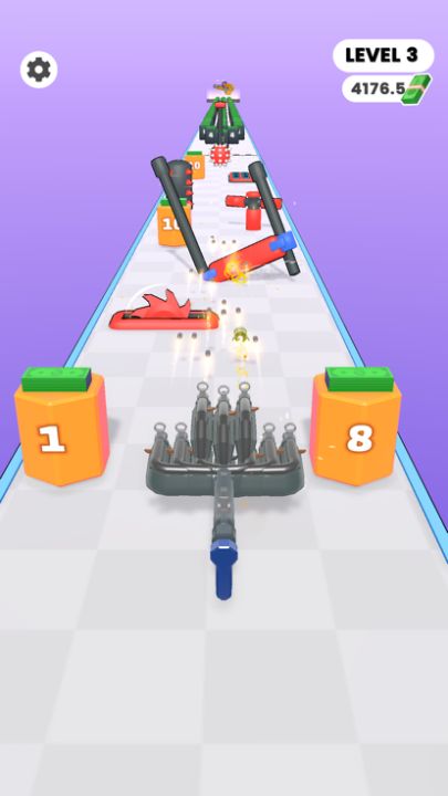 Collect the cards found on the road and enchance their barrels in the mini game.