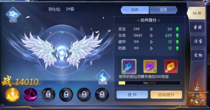 这是造化攻略的最后一篇啦,不知道大家对造化攻略是否已经全部了解和掌握了呢~当仙友们的等级达到160级。经历过渡劫之后就能够获得仙羽,这是证明各位仙友们在漫漫休闲路上的小有所成的一个标志。在【仙羽】界面我们能看到组成仙羽的几个部分,分别是【培养】、【羽灵】、【化形】【培养】同样的也是需要升级道具分别是初级仙羽精华(使用后可增加500经验)中级仙羽精华(使用后可增加1500经验)高级仙羽
