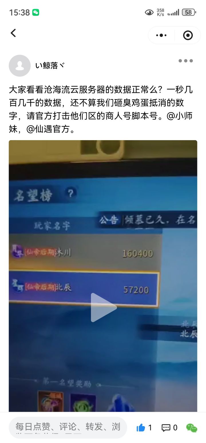 他们区一共几十个人,这数据量明眼人一眼都懂,还不算我们手动砸臭鸡蛋抵消的数据,这些脚本号商人号严重破坏游戏。@仙遇官方@小师妹#今天游戏圈发生了啥