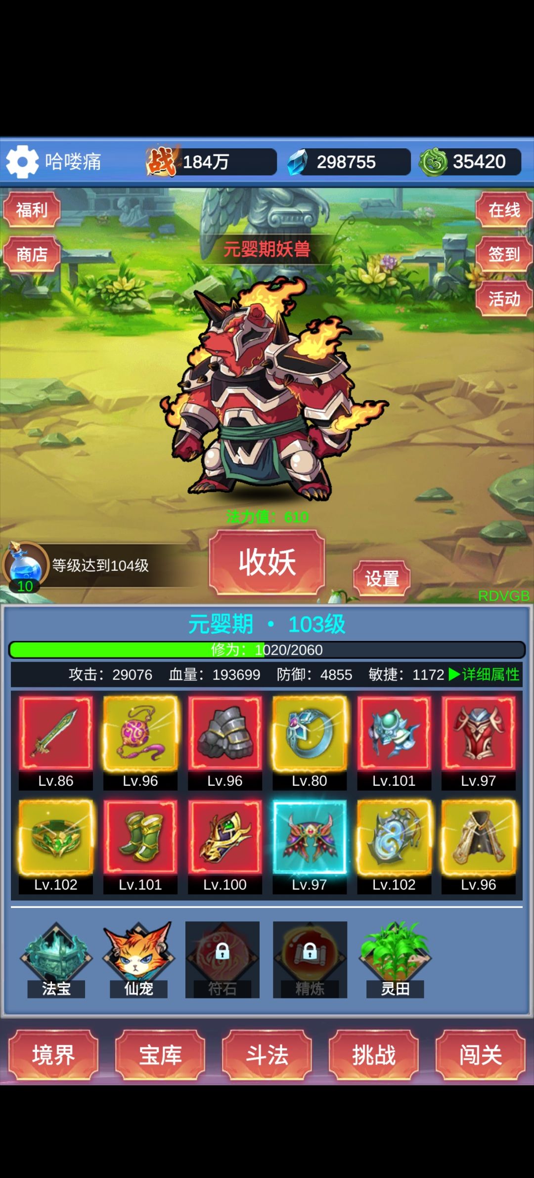 1.进游戏先领礼包v100 v200 v300 vip svip 2.出现福利的时候直接看广告五倍奖励然后买灵石跟境界丹,提升境界能到多少到多少,境界越高打的越远 3.法宝选择都可以,升级是通用的,看boss选择用哪个 4.宠物可以第一个用飞马,红色都要留起来 5.获取的氪金按需要购买,体力可以都买了 6.种植,体力另一种来源,全开吧,反正都要开的