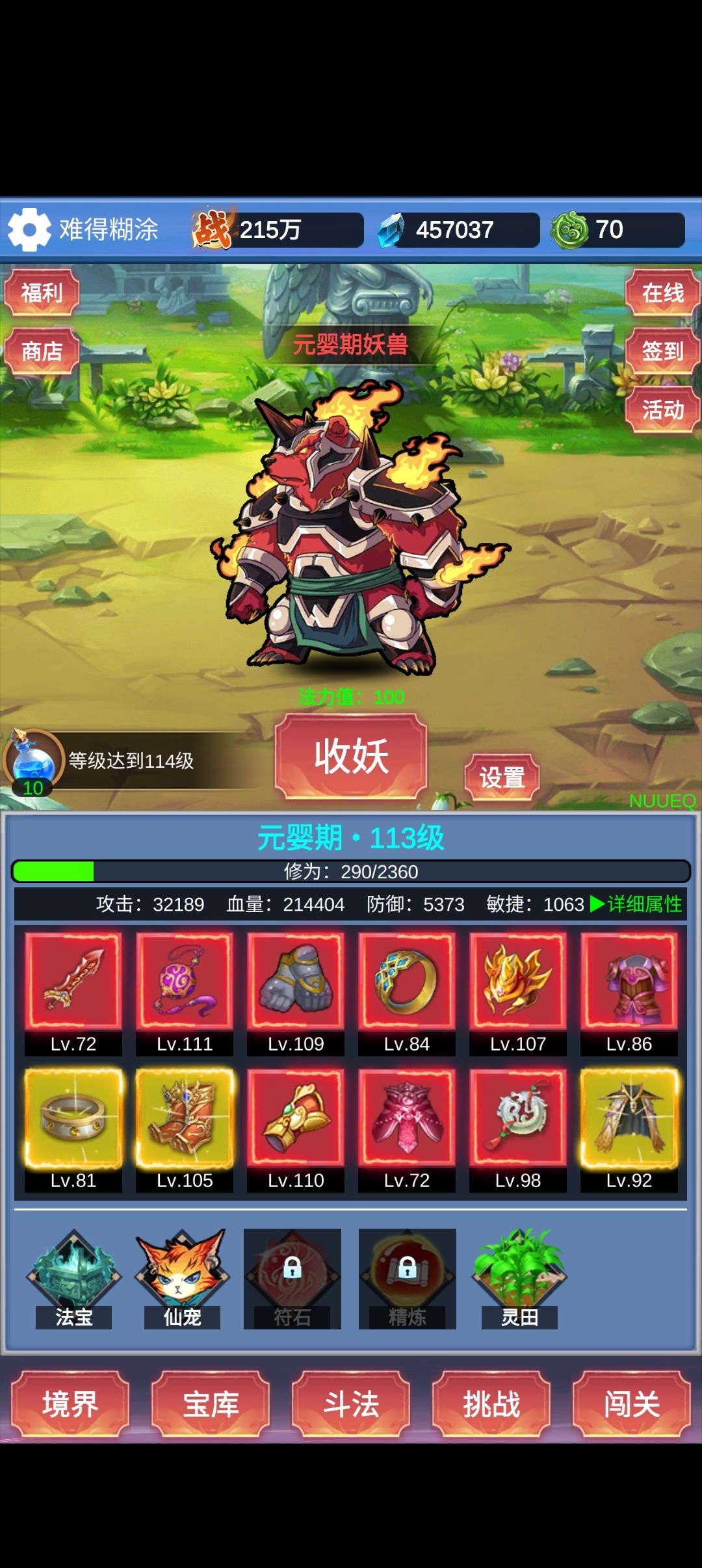 收妖 天降财富 (看视频)一定要把月卡和周卡优先买上 基本开荒介绍到此为止 大概第一天 大家玩了顺 75万战力左右 第二天 200万左右 第三天 400万左右 属性选择 前期 选择击晕配合小飞马可以越战 100万战力中期 选择连击打挑战万妖能获得更多收益 400万战力以后 选择闪避 一定要有仙兽神女以后再换闪避 (必须仙兽技能里有加强闪避和疾速) 这一套闪避流 对斗法和闯关收益很高 最后就是这