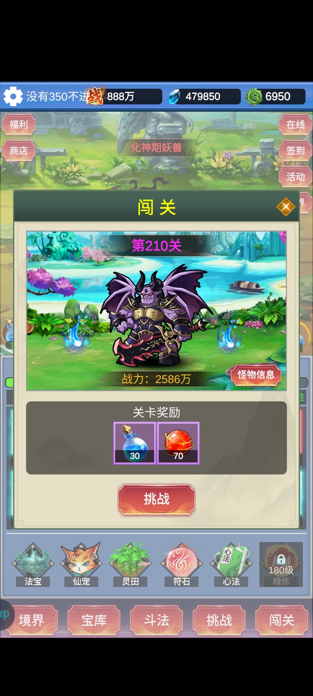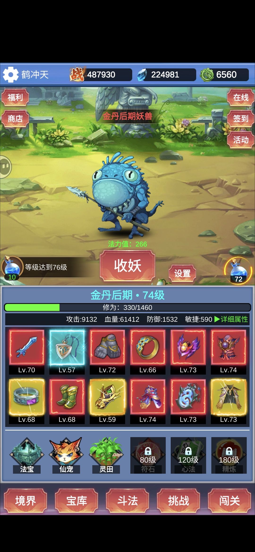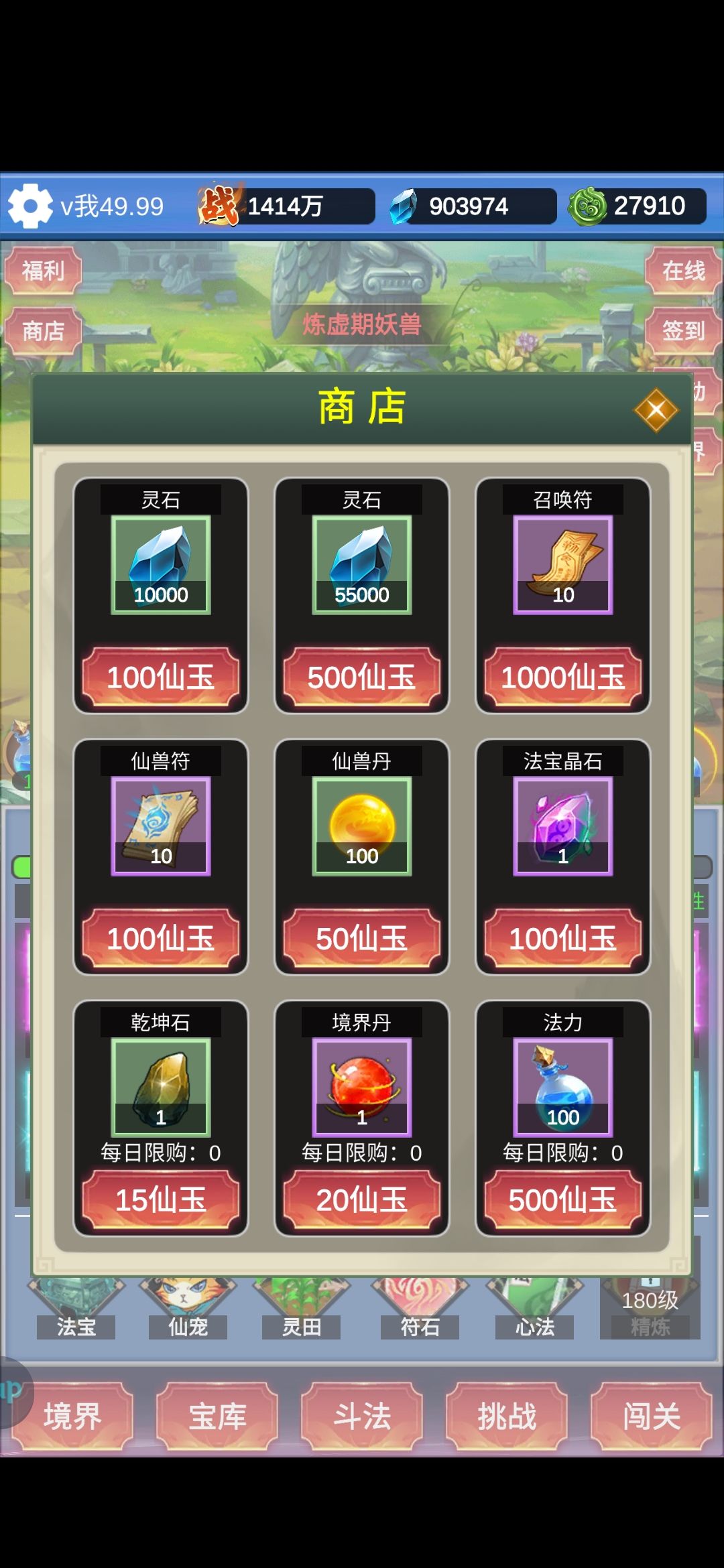 本游戏最重要的资源是法力,其次是进阶石。 法力直接影响你的装备、等级、氪金卡的获取量、灵石、斗法中能够到的门槛boss。 进阶石影响进阶速度,也就是你获取装备的品质。 所以所有的资源都应该倾斜于购买法力其次进阶石,比如商场里最下面一排的限购,每日礼包里含体力值的礼包,灵田里的土地等等。 在没有进阶之前,法力可以不用着急都用完等到进阶以后再用。 宠物选择,一共三个红宠,选独角兽出战。 装备选择,前期