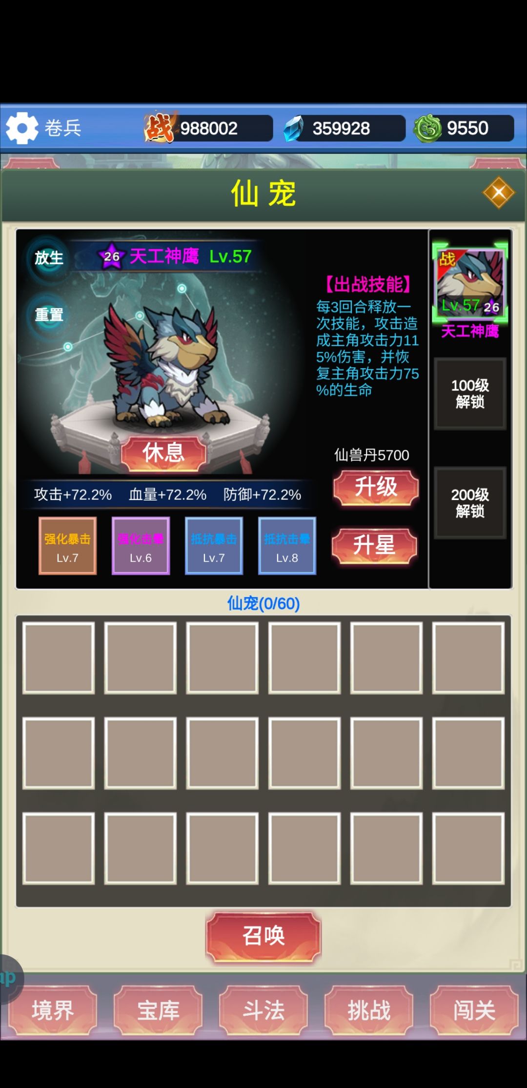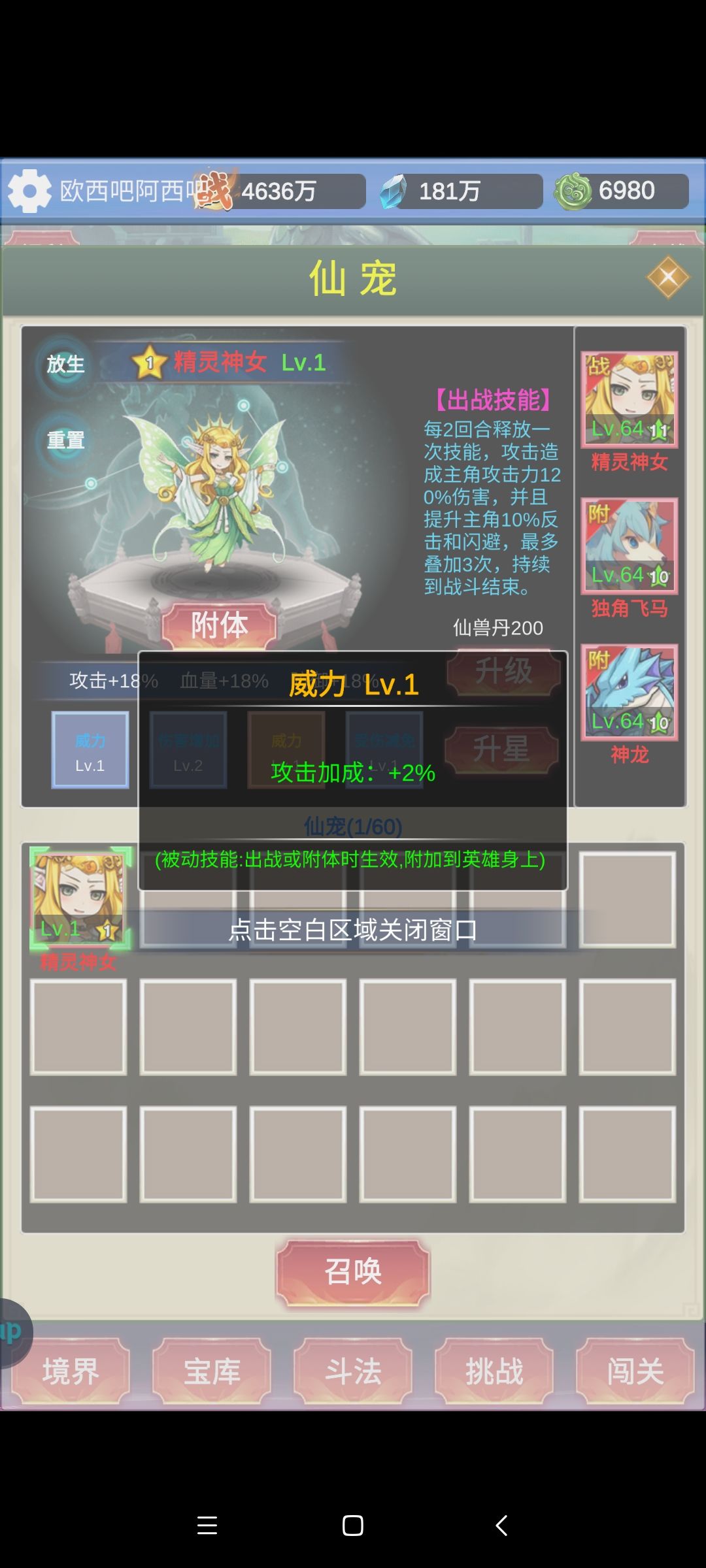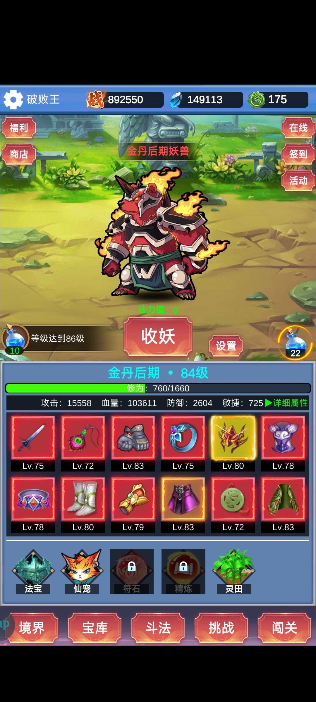本游戏最重要的资源是法力,其次是进阶石。 法力直接影响你的装备、等级、氪金卡的获取量、灵石、斗法中能够到的门槛boss。 进阶石影响进阶速度,也就是你获取装备的品质。 所以所有的资源都应该倾斜于购买法力其次进阶石,比如商场里最下面一排的限购,每日礼包里含体力值的礼包,灵田里的土地等等。 在没有进阶之前,法力可以不用着急都用完等到进阶以后再用。 宠物选择,一共三个红宠,选独角兽出战。 装备选择,前期