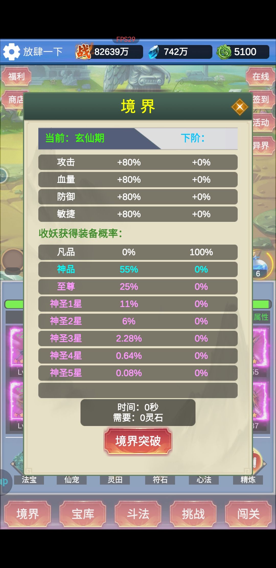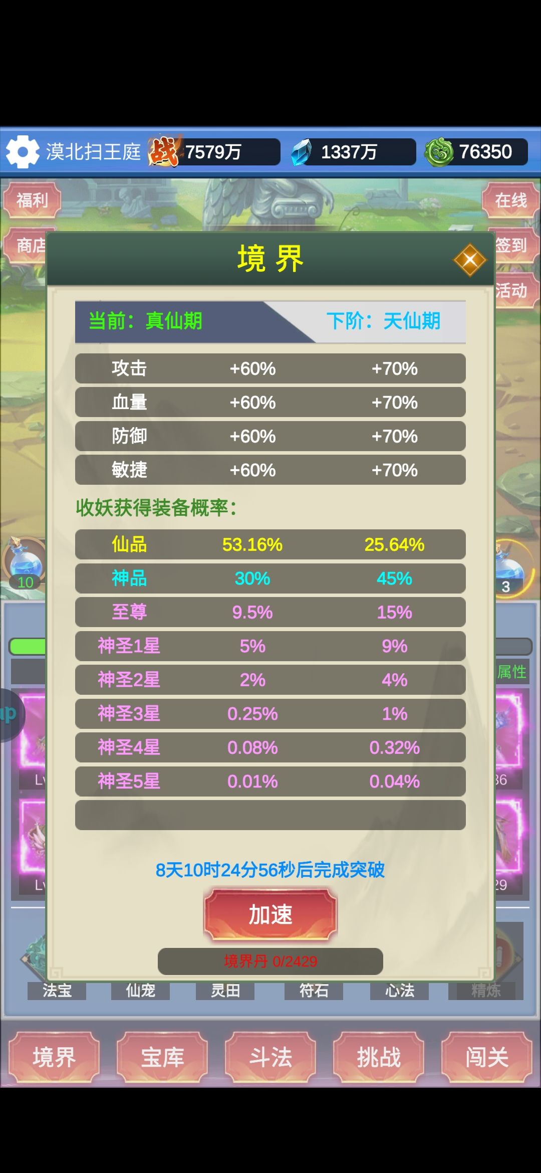 前几天玩过一把,两天,游戏后来删了,今天没事又下来玩一下,开了两局,有一些经验,分享一下,大佬勿喷。 1 开局灵石够了立刻升级境界,境界优先,礼包里面优先买境界丹和法力。境界高,出的装备才好。 2 仙品装备出来后,尽量选择眩晕词条,别的都不太好使。大家都用眩晕,怕作者改 3 宠物选紫宠,技能尽量带橙色强化击晕,然后就是升星,提升宠物技能等级,升满+25眩晕,初期就靠他。100级以后再来个同样的宠物