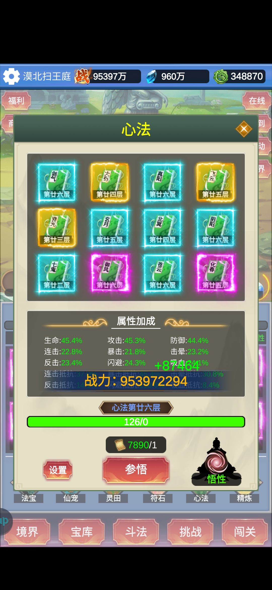 本文主要讨论战力的形成和实际操作 关键词: C1属性,就是攻防体敏基础属性。属性=装备+法宝+精炼。 C2词条,就是连击暴击击晕反击闪避吸血和对应抗性词条,以及其他高级词条。词条=装备+法宝+宠物+符石+心法,其中以装备和宠物(主要是后期)为主,其他辅助。 C3属性倍率(以下简称倍率),就是攻防体敏的加成百分比。倍率=宠物+符石+心法+境界,其中以宠物为主。 T1体力,体力=法力=等级=装备=属性