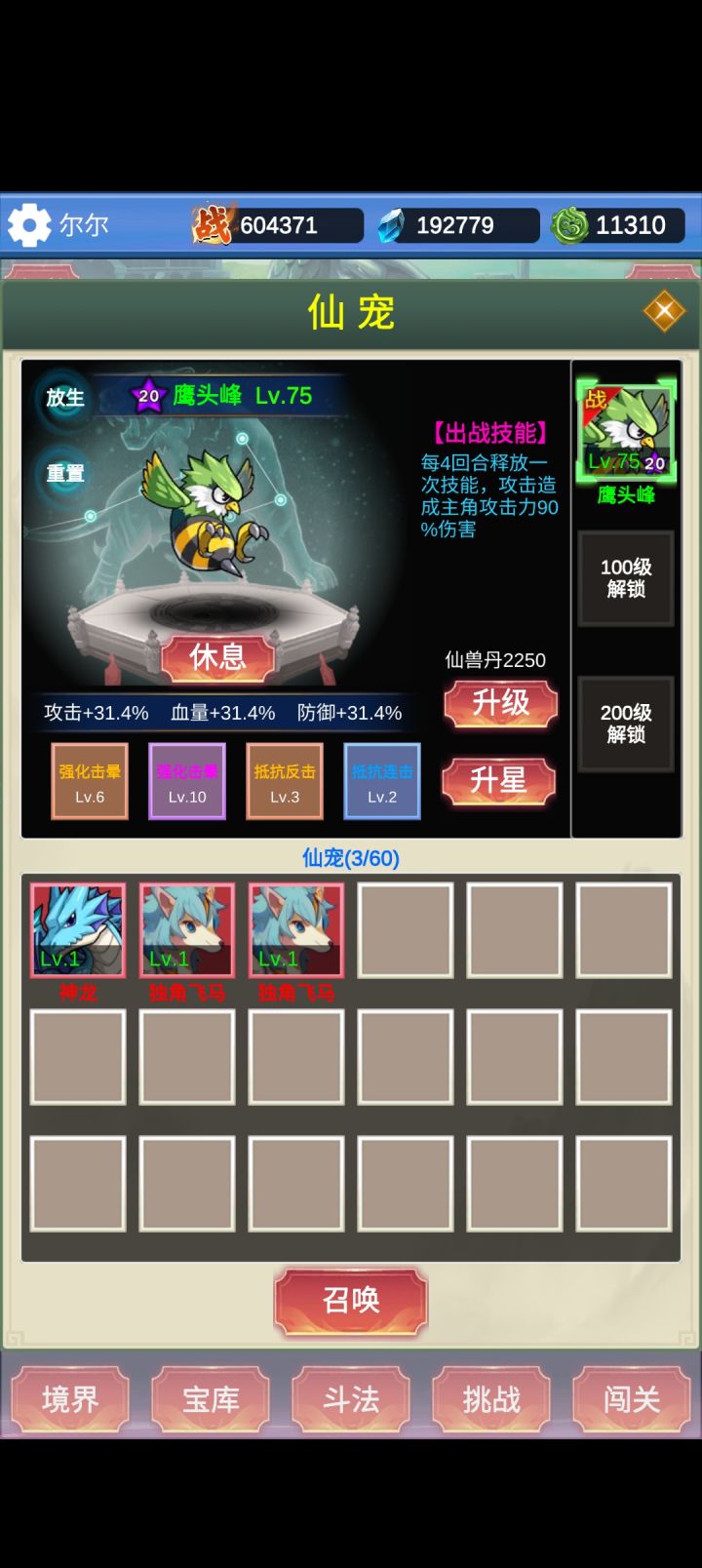 想要好的宠物技能,满星了都没刷出来。现在想要闪避>暴击>追击,感觉打试炼妖王伤害厉害,我现在最高好像一次24宝箱