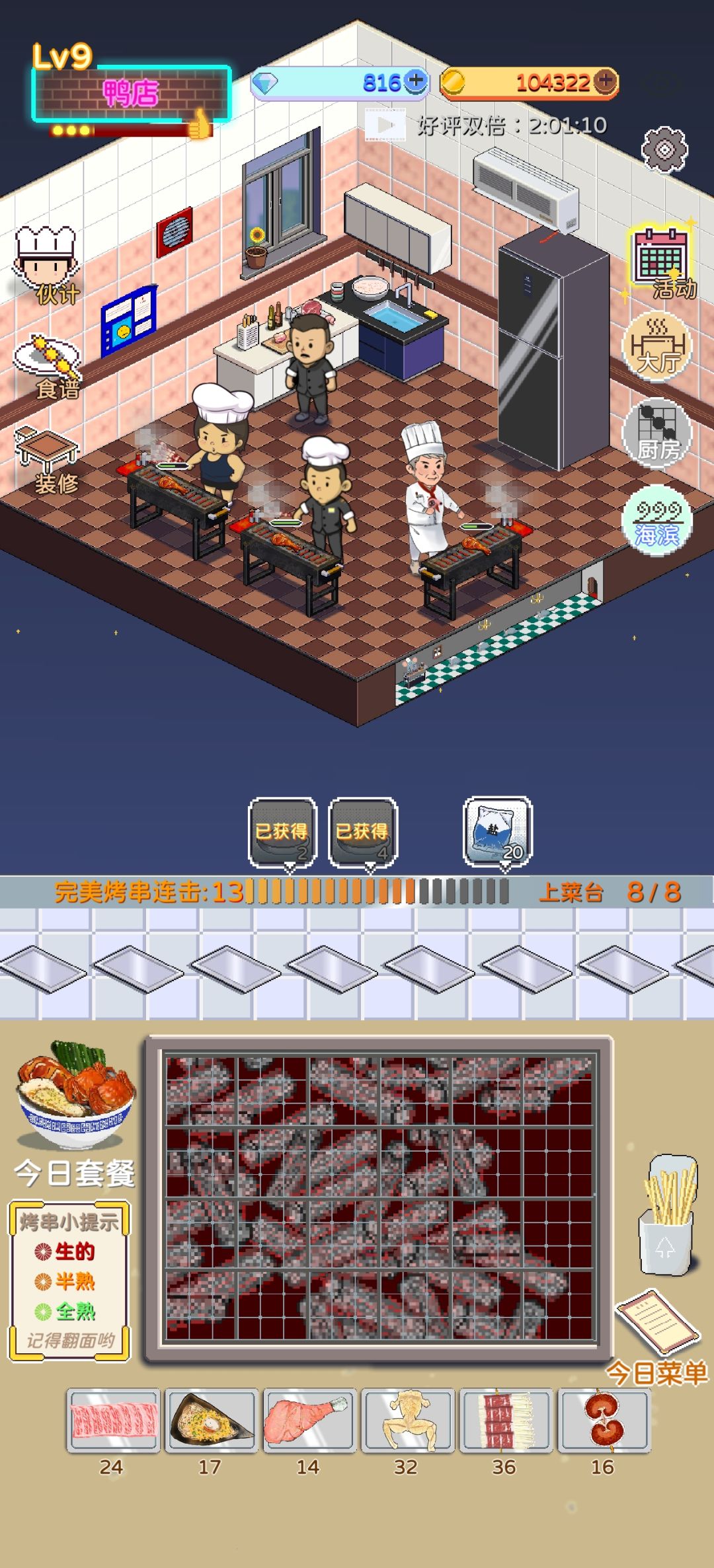 我觉得想快速刷钱最主要的一个问题就是:在供不应求和高价菜之间做权衡。 全贵菜做不过来,全低价菜收益小。 所以我摸索了一下后了,想出一个能完全躺平的模式:2贵+2多+2低价/爱心 1、前两个菜可以上贵价菜:比如肋排,带子,芝心蟹(推荐带一个芝心蟹,占位小烤的快,手动烤几下就几百盘,然后就可以摸鱼,不想手动也随意。) 2、中间两个上盘数多的菜:那些12盘/次的菜。挑两个价格稍微高一点的百元左右的,