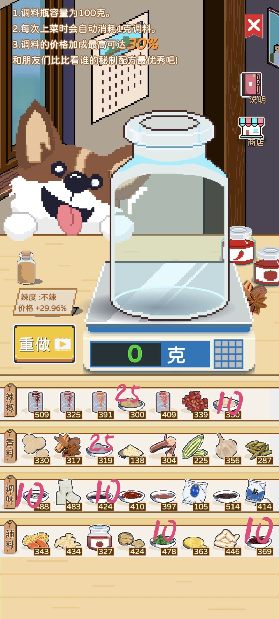 价格30 牛肉酱20葱花20耗油20生抽20孜然20 价格30 重度辣20微微辣20五香粉20花生20核桃20 价格30 中度辣20紫苏20丁香20茴香20核桃20 价格29.96 胡椒10椒盐25紫苏25生抽10耗油10牛肉酱10葱花10 价格29.11 魔鬼椒20丁香20甜面酱20耗油20番茄酱20
