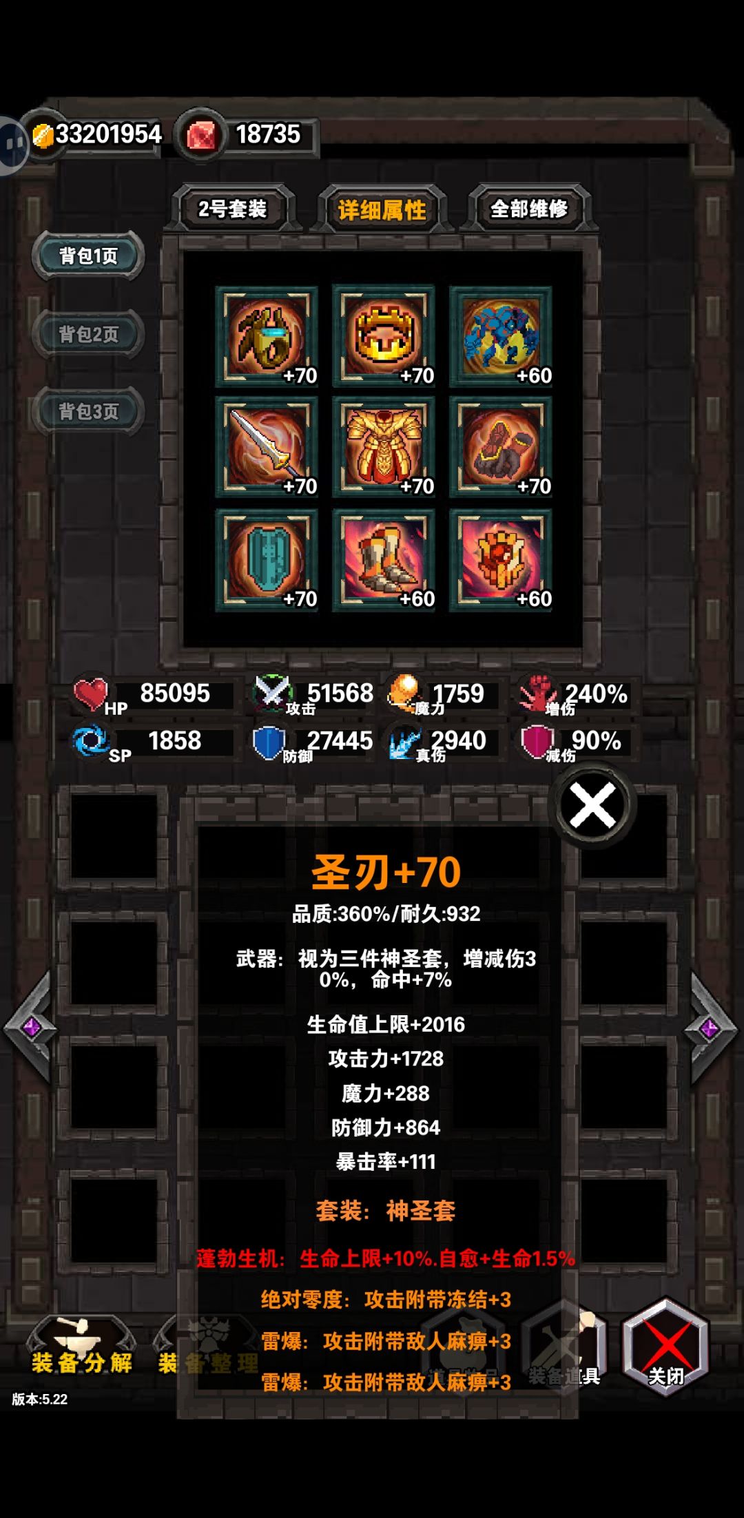 个人认为的5.22版本最强套装。 对于Boss只弱“暗域之主”(与其战斗时可以轻松快速吃到上万层毒的增伤,代价是玩家很快暴毙),除了“毁灭之龙”在伤害强化到6亿(普通模式3亿)后可以击杀,对于其他Boss都是300回合内速杀。 强烈推荐培养 ●装备特点 ▶毕业套全套最高魔力面板,同时蓝也不低,直接玩技能点电主动,开技能时魔力会给额外增伤,带来更高伤害的同时续航完全没问题[吸血=(攻击+魔力)*增伤