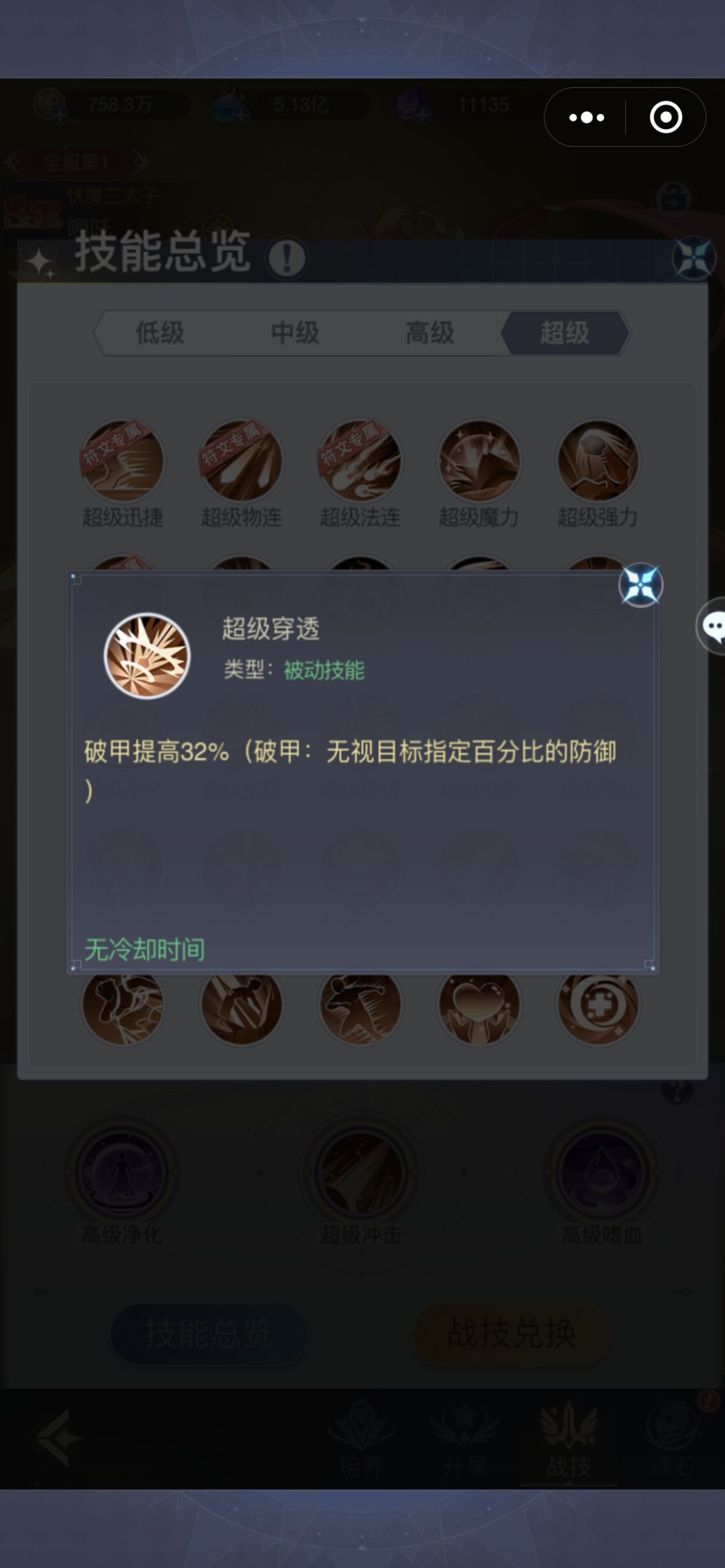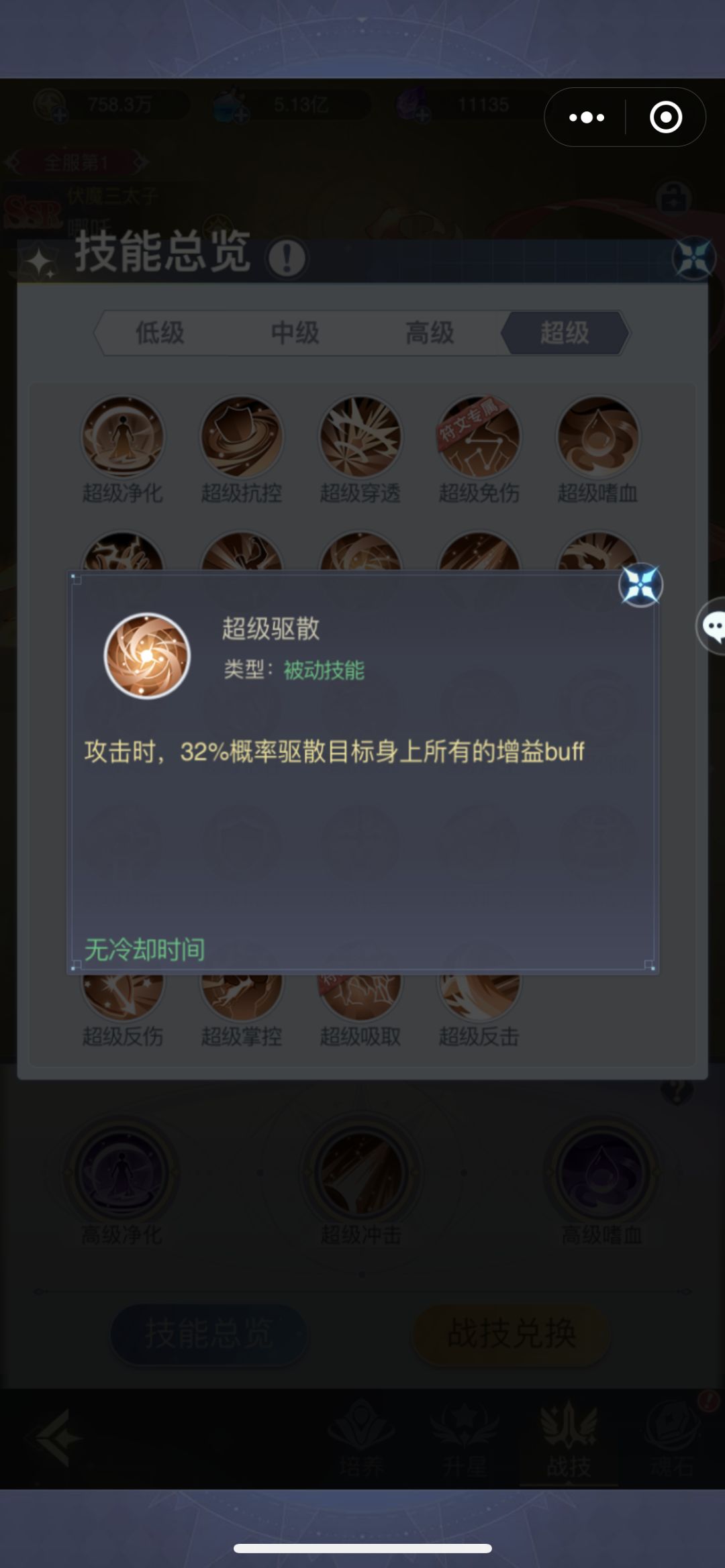 8.超级驱散,可以驱散护盾,32的概率,顶级40,也是很不错的。并且是驱散所有,你们平时打架看buff栏都知道那buff一大堆。很推荐。法师,15哪吒都建议带。 9.灭魂,防止复活。看情况,后期是需要的。 10.超级减速,算是一个对策技能,可能有时候你需要通过一些速度调整来实现你的战术,就能用到了,当然,也就是很认真玩的人需要,休闲玩家不用管它。 11.超级抗控,给哪吒的,虽然控制不是单纯的加减法