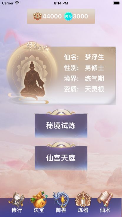 此应用为一款模拟修仙打怪、位居仙官的挑战游戏,初始玩家选择男女修士其中一个开始进入修炼。玩家可通过修行提高自己的境界和属性。可炼化法宝提高自身战力。可通过炼器强化装备的等级。可修炼仙术提高等级加强战力。可培养御兽成为伙伴加强战力。可通过秘境试炼不断提高自己。可选申请加入仙宫天庭。