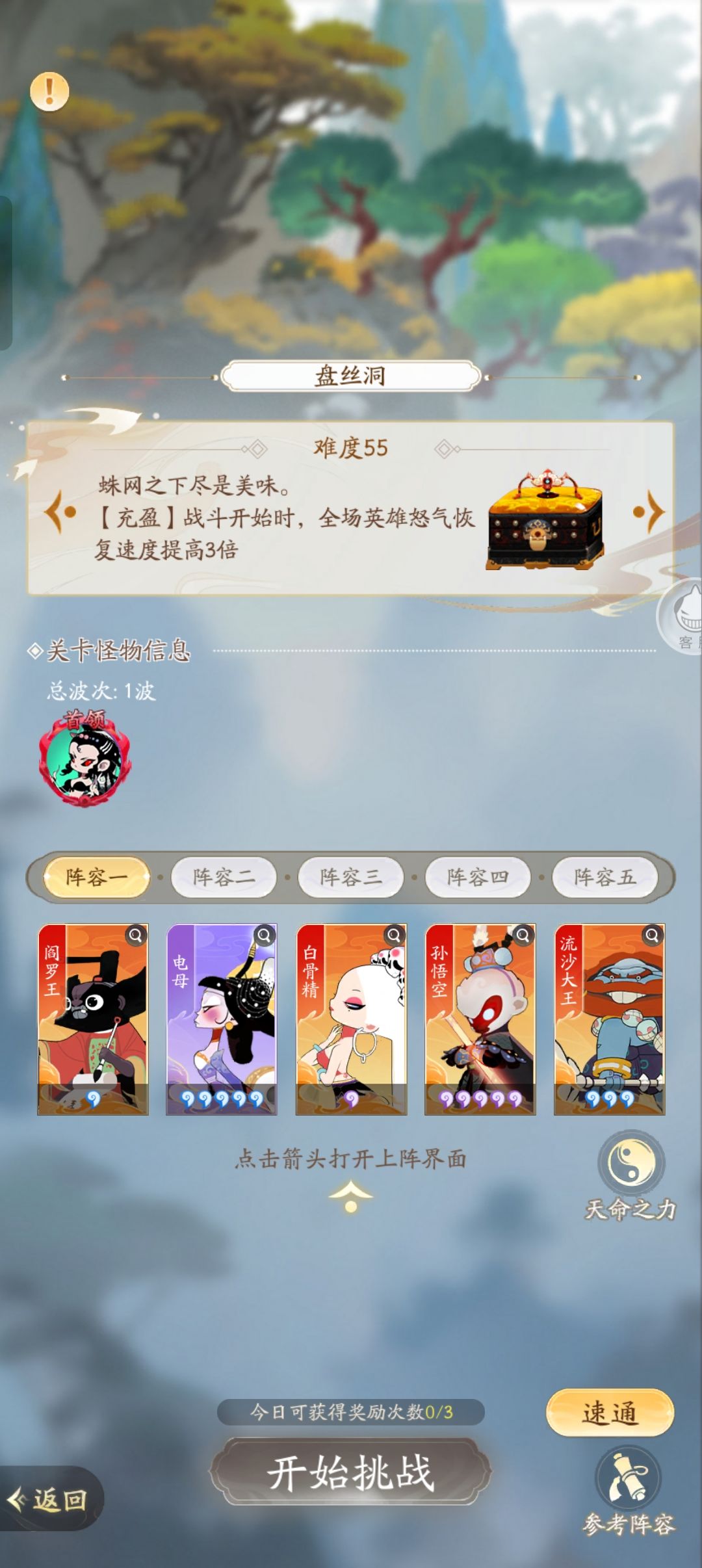 (六)玩法地图攻略,①登神天阶,前面1000关左右推荐阵容是孙悟空,牛魔王,白骨精,铁扇公主,玉面狐狸(也可换为黑白无常)。2000关以后用猴子,白骨,牛魔,黑白,文曲。官方在3.8号加强了牛魔王一波,而且本人亲自测试,手动把登神天阶从第一关打到第1200关(本人也一直在手动打登神天阶)只有2%的失败概率。用第一套阵容打到2000关以后,就比较吃力,打不过就换第二套阵容。 ②盘丝洞,推荐阵容是阎王