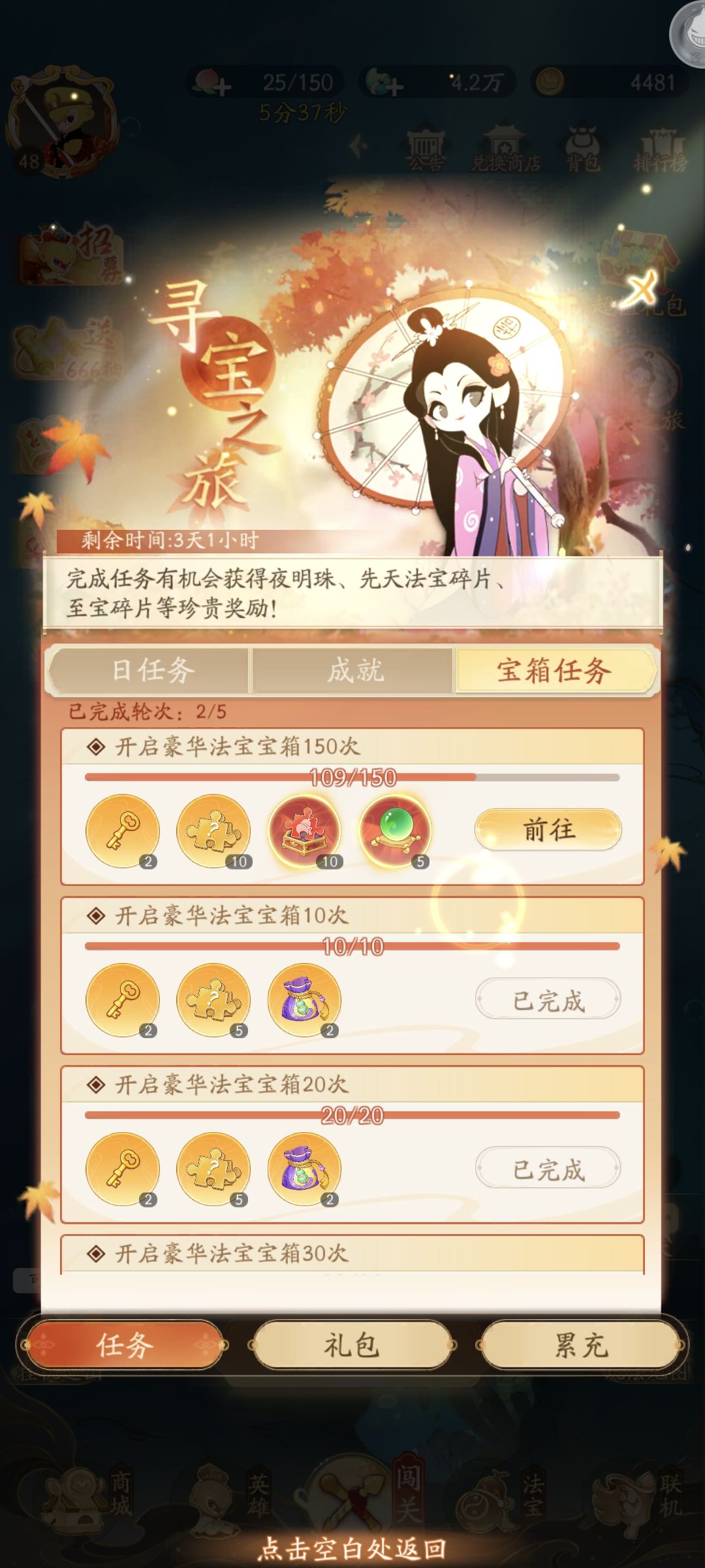 对于萌新来说对这个游戏充满了未知,不知道怎么玩或者收益最大化,由我这个踩过坑的开服玩家给大家分析一下。 人物招募:招募获得重复人物可进行升阶,进阶会给人物加技能等级,升阶会获得对应的强化点可进行升阶强化,攻击力提升很显著。获得指定人物可结束羁绊,羁绊可对全人物加成。人物最高等阶十八阶,多出的会自动转化轮回币。 法宝招募:招募重复的法宝可提升法宝属性,其中最终增伤,法宝攻击百分比提升最大,法宝可
