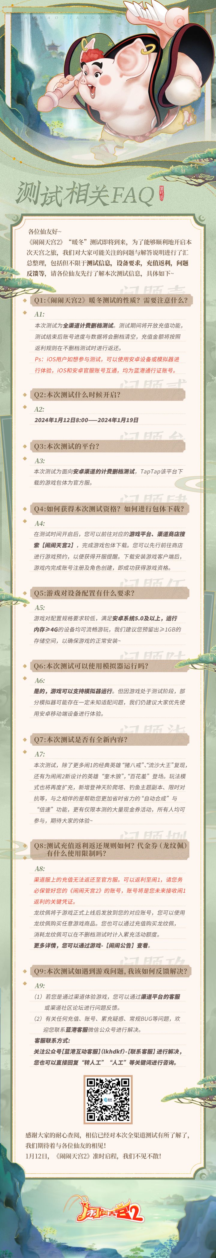 各位仙友好~《闹闹天宫2》“暖冬”测试即将到来,为了能够顺利地开启本次天宫之旅,我们对大家可能关注的问题与解答说明进行了汇总整理,包括但不限于测试信息,设备要求,充值返利,问题反馈等,请各位仙友先行了解本次测试信息,具体请见长图~