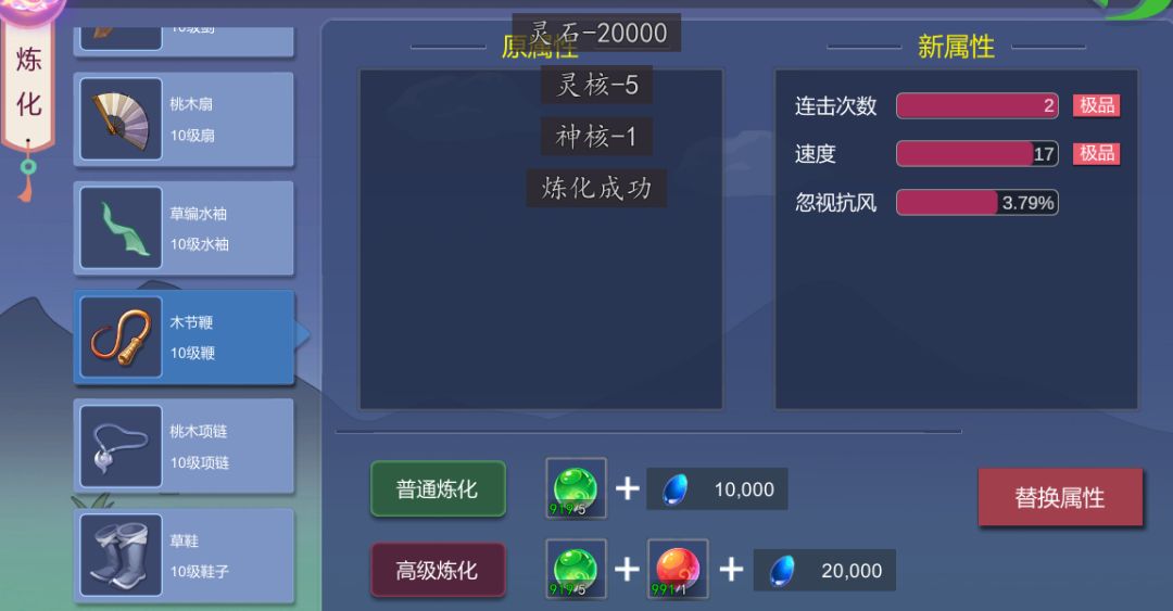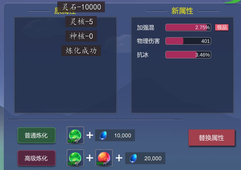 本期将高级炼化属性和区间进行梳理。属性随机出现在三个数据条,每个数据条单独判定 相比普通炼化来说,除了数值区间更大,更有新的属性加入! 帽子:强仙法1-4;强人法1-3;强妖法1-3;抗仙法1-5;抗人法1-5;抗妖法1-5;血100-500;法100-500;抗毒20-100 衣服:强仙法1-4;强人法1-3;强妖法1-3;抗仙法1-5;抗人法1-5;抗妖法1-5;血100-500;法100-5