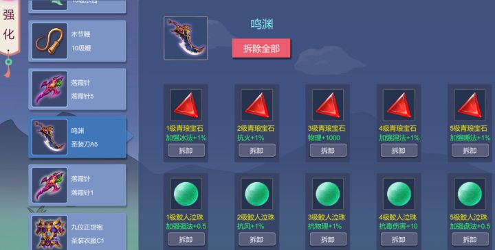 强化物品分为两大类1.青琅宝石,用来强化基础属性(1-5级)2.鲛人泣珠,强化炼化数值(1-5级)1-4级单独产出,5级可用3个四级25%概率合成,消耗100W灵石强化一次消耗10W灵石玲珑装备可打2个青琅宝石(1个1级,1个2级)、鲛人泣珠(1个1级,1个2级)1-3级高级装备可打3个青琅宝石(1个1级,1个2级,1个3级)、鲛人泣珠(1个1级,1个2级,1个3级)4-5高级装备可