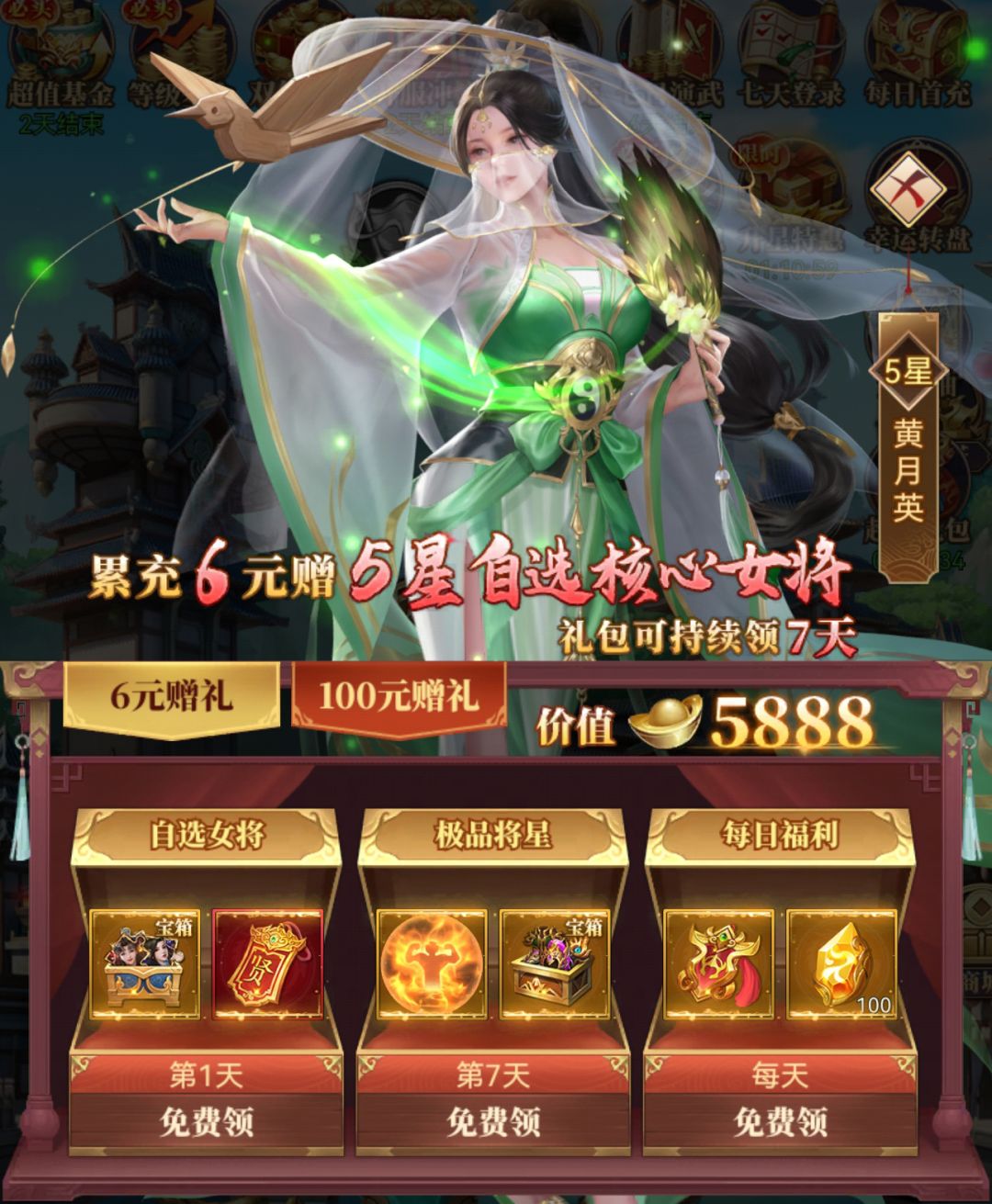 氪金一直都是大家比较关注的问题,微氪应当以快速抽出核心武将,搭配阵容为主,满屏的活动眼花缭乱,但究竟哪些礼包性价比高呢! 6元首充基本是所有手游里最划算的一种活动: 6元首充道具:自选女将(小乔、甄姬、黄月英、蔡文姬、张春华)、招贤令*1 除了张春华其他全是奶妈,可以快速进行阵容搭配,如果已经抽出奶妈,还可以快速升星,招贤令也可以指定抽取某个阵营的英雄。 最主要是7天赠送的怒火将星,游戏进入战斗