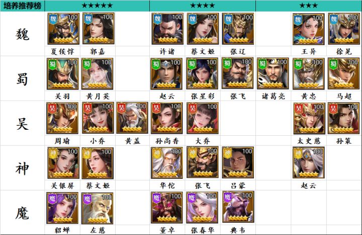 推荐榜主要针对普通玩家前期会使用到的英雄进行推荐,主公以及较难获取的稀有武将不在里面,5星推荐是前期使用体验较好的武将,最好根据实际抽到的武将进行搭配。 魏国阵营1. 夏侯惇:前期容易获得,平民战神,推塔利器,伤害很高,但是会自己烧血容易暴毙 将星推荐:强攻、狂暴、暴杀、突进将魂及战法技能推荐:物连、溃诛、嗜血2. 郭嘉:前期不易获得两只(氪金除外),全魏阵营可练(不要徐晃和夏侯惇的另外