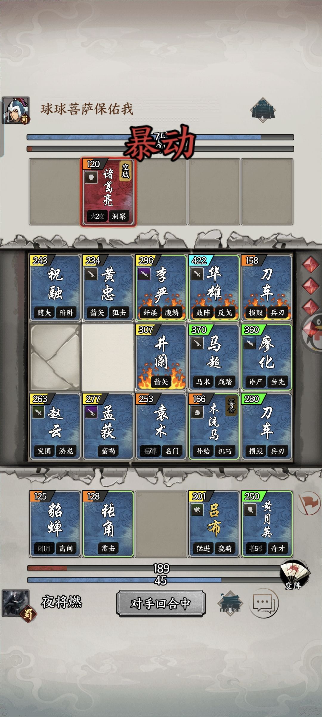最近我们蜀国新增金关羽,可谓热度拉满。奈何家境贫寒,每天就充8块钱,等过一个星期才能组合出金关羽阵容(理想情况是 月英金关羽牛马李严庞统)。所以一直在实验其他阵容,无意中规划出这个阵容,个人感觉非常好用,特来tap和大家讨论。 思路分析: 1.必备条件:月英5技能,效果获得行动点时随机减一个角色cd。 诸葛照明将星 (对面明牌 然后决定打牌思路)牛马那个靠近会获得行动点将星(配合月英) 2.对局行