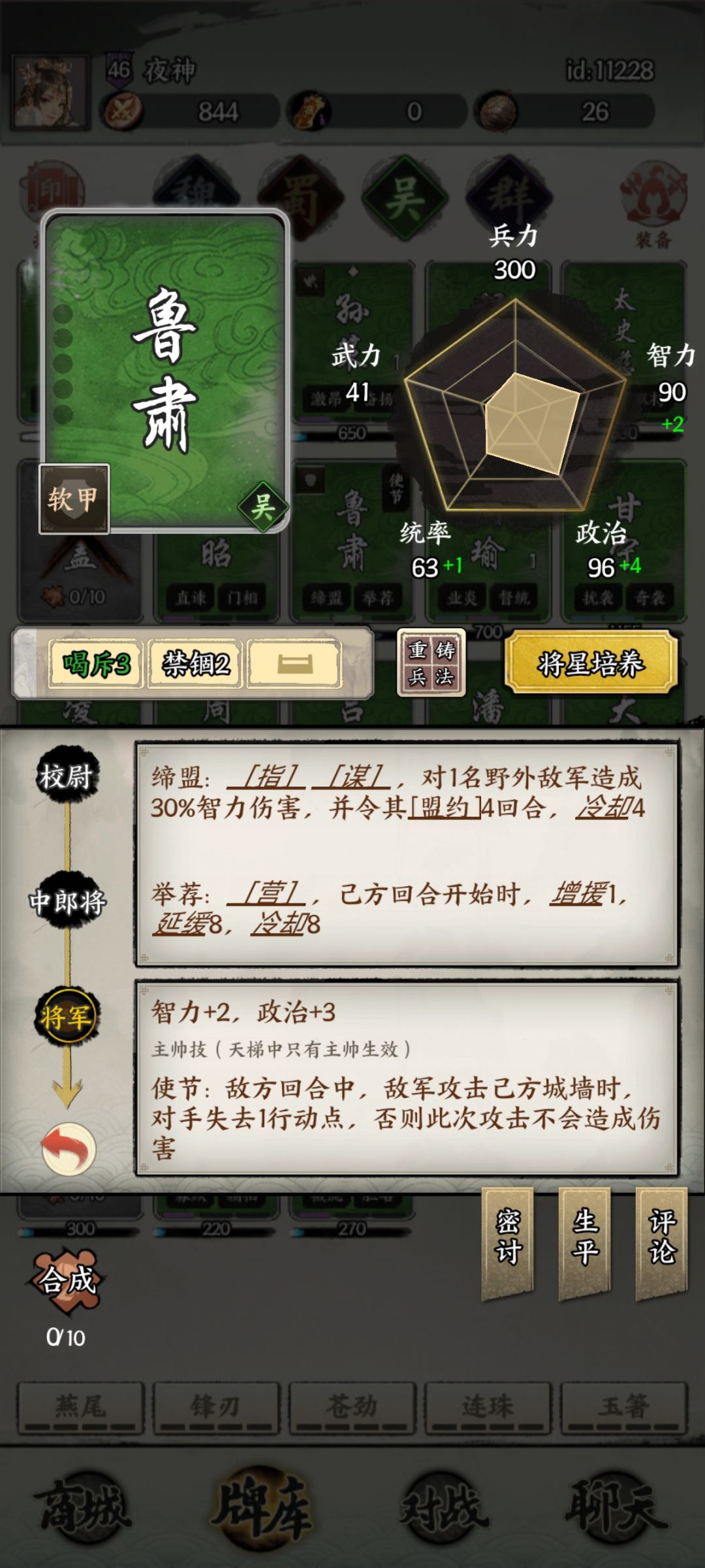 给大家分享一下我的吴国阵容 目前是挑战赛2段位 我用这套阵容已经十连胜了 第一位鲁肃 早期感觉鲁肃比孙权强,举荐是被动技能,比征召要节省一个行动点,然后我就先给他升了3,开始挺有用的,但是玩到现在看起来作用不大,建议升2就行,鲁肃有一个【湘水划界】技能,特别高效,建议带上! 第二位是公孙瓒,这英雄配合凌统只能说谬撒一切! 每回合初次移动可以增加行动点, 可以加一个弓骑兵。 弓骑兵初次行动也可以加行