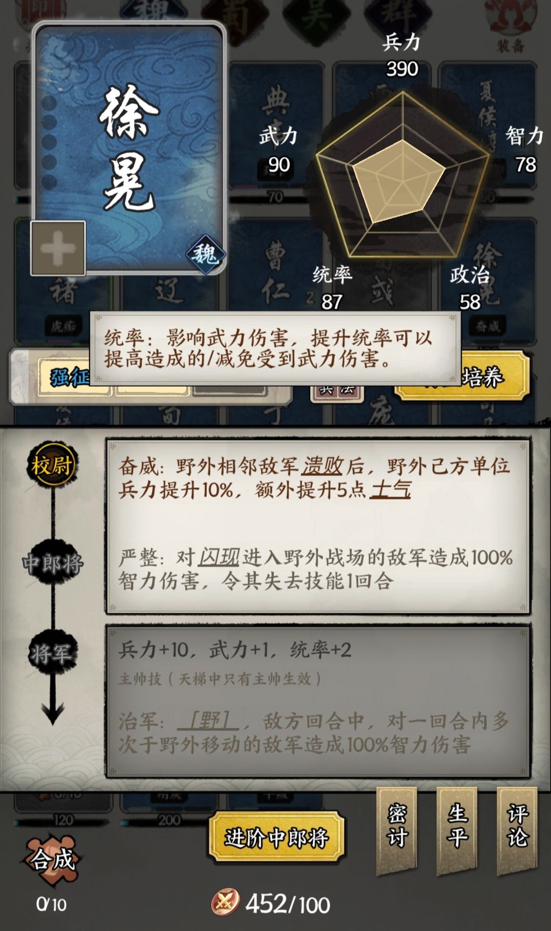 首先武将界面,五维图上的5个属性都是可以点的,方便了解属性的作用,如图1。 功勋: 用来解锁武将的二技能和主将计。 令牌: 用来重铸兵法。等级有保底,会额外加1级(老服封顶加7级)。3%概率开2槽,无保底。 龟甲: 用来卜卦,如图5所示,重铸后下边的小指针是可以滑动的,可以锁定等级来刷新类别等等……1槽刷新一次需要1龟甲,第二次翻倍,以此类推,最多卜卦2次。 金龟甲: 龟甲的进阶道具,选项-问卦中