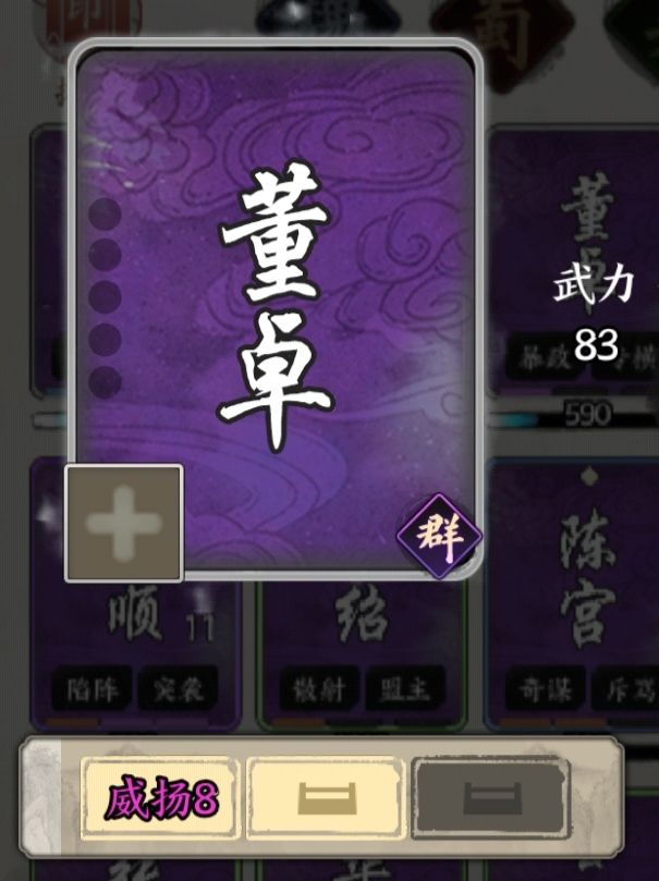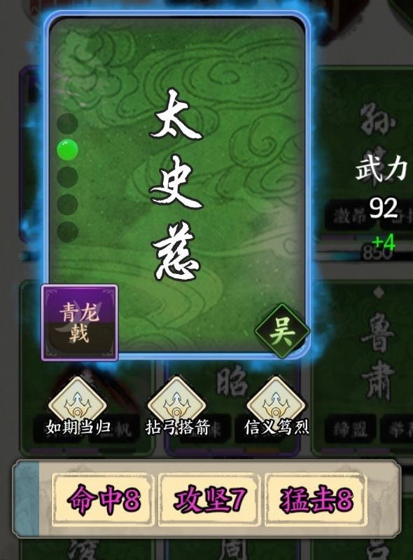 吉平 汉 250询疠 [指][谋] 指定一名敌方单位,对其进行1%治疗,然后令其[中毒],冷却4。烈医 [锁] 己方回合结束时,对所有拥有异常状态的敌军造成60%智力伤害,若没有击溃敌方单位,则失去100%兵力。主将寄指誓 [限] 己方单位因失去兵力溃败前,你失去10%兵力上限,令其回复30%兵力。酱星询疠问疾 [询疠]有概率额外造成[燃烧][浸水][眩晕],每种状态有50%概率造成。诛贼讨逆 敌军每有一种异常状态,[烈医]便额外造成一次20%的智力伤害。嚼指为誓 [锁] 初始只有90%的兵力上限,己方单位即将翻面时,失去5%兵力上限防止之。毒火攻心 视为拥有[溃疮10],且必定触发。忠肝义胆 己方单位击溃敌军时,自身提升15%兵力上限,限3次。