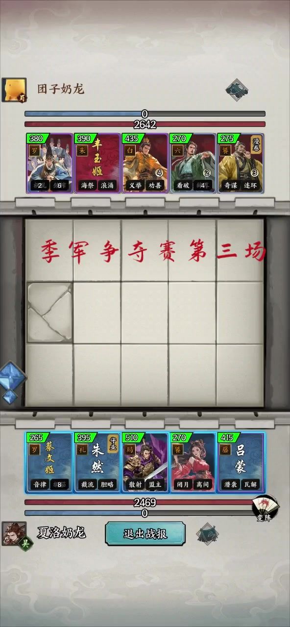 夏洛成功猜到团子阵容掏出来强氪的白貂蝉加袁绍,团子戴上了痛苦面具,最终落败,恭喜夏洛获得季军!
