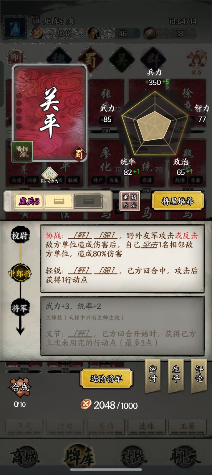 首先附上本人段位,平民280胜到王者之巅3100。新手礼包还在。第一赛季:3月30王者之巅3100。兵法:1个2槽,4个1槽。将星:无将星。装备:五个绿色。成功登顶王者之颠3100。第二赛季:4月15王者之颠3013。兵法:1个1槽马超,3个2槽,1个3槽关平。将星:5个1将星。装备:5个蓝色装。成功月中4月15登顶王者之巅3013,简单说下自己登顶的心路历程。前期到挑战段:刘备,关羽,