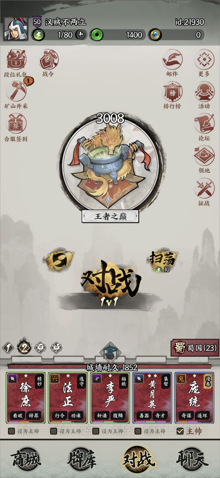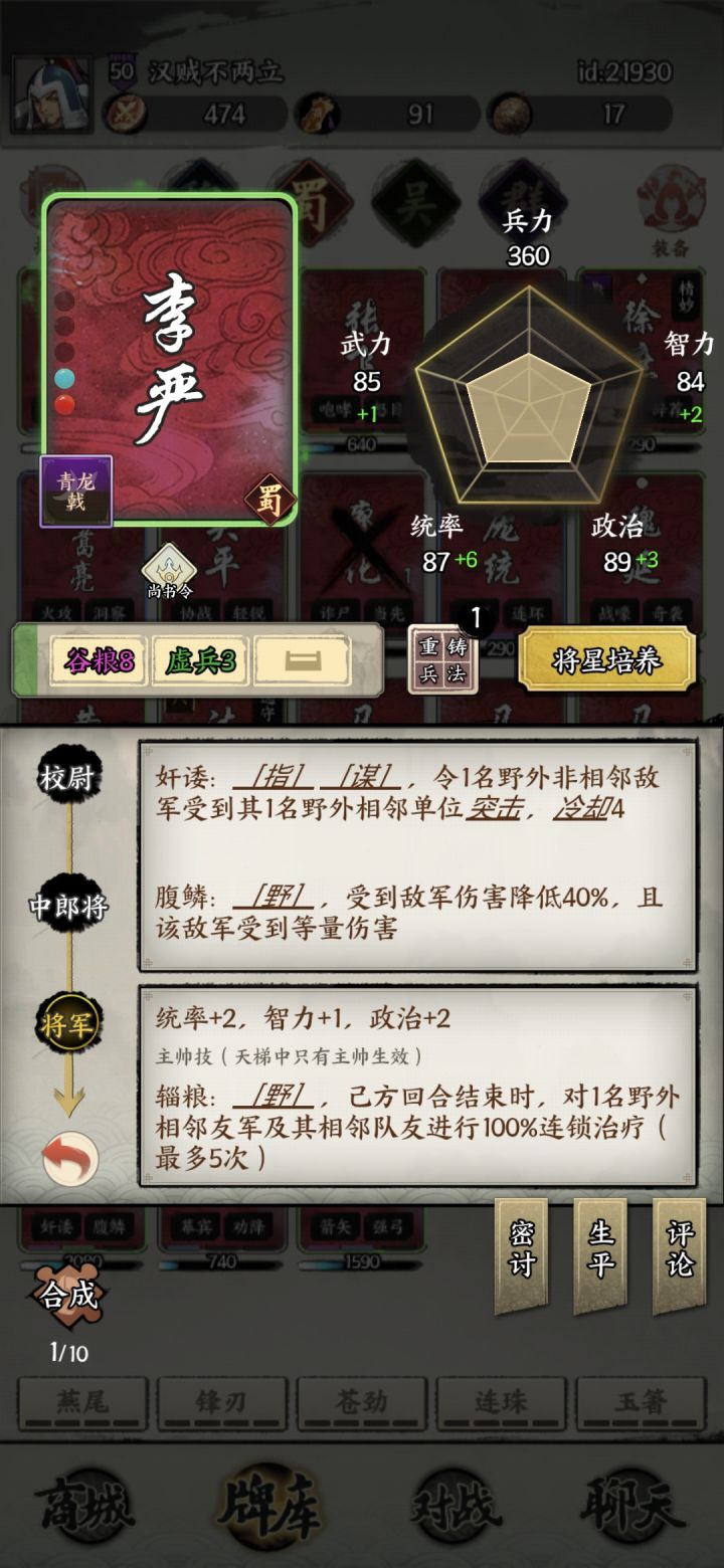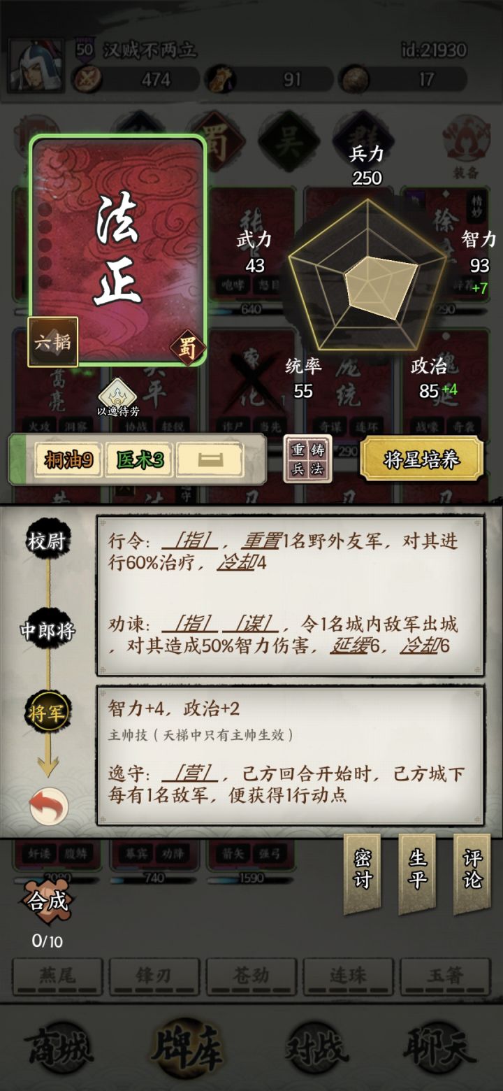 庞统主(必须)徐庶 重铸论破要高 其次虏役 其他无硬性要求 将星优先精妙绝伦庞统 重铸论破虏役桐油 尤其是桐油 将星有点铁蒺藜李严 重铸保命技能 首推谷粮 然后抗辩 将星必须要尚书令法正 重铸桐油论破 尤其桐油 配合铁蒺藜可以刷新技能冷却 有很大的战略意义 比如开局放自己城下铁蒺藜 法正打铁蒺藜 第二回合就能拉对面城里的徐庶 将星必须要有以逸待劳月英 重铸桐油优先 配合庞统 同理可以刷新