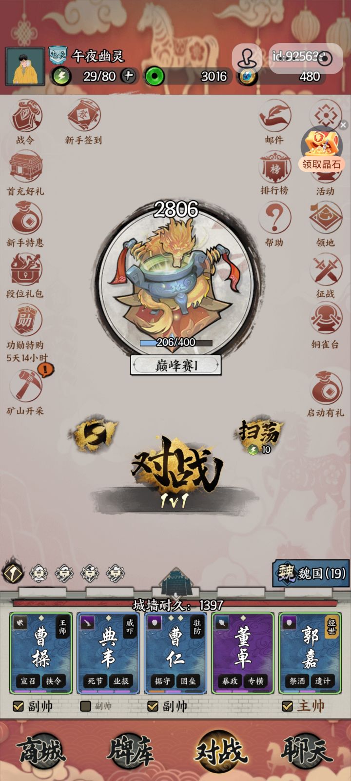首先附上本人段位,平民280胜到王者之巅3100。新手礼包还在。第一赛季:3月30王者之巅3100。兵法:1个2槽,4个1槽。将星:无将星。装备:五个绿色。成功登顶王者之颠3100。第二赛季:4月15王者之颠3013。兵法:1个1槽马超,3个2槽,1个3槽关平。将星:5个1将星。装备:5个蓝色装。成功月中4月15登顶王者之巅3013,简单说下自己登顶的心路历程。前期到挑战段:刘备,关羽,