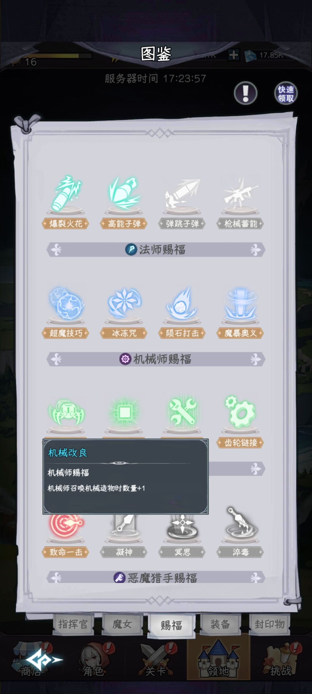 (这种玩法非常适合主线还有其他格子偏少的情况,在极限挑战也是能适用的)我看很多人都喜欢恶魔猎手的通用羁绊,确实多羁绊很强,但是有一点很多人都没搞明白,当场上全是一个职业的时候,会出卡是专门的职业提升的,这类卡加成都偏高,一但你带一个其他职业都大概率给你其他职业的,赐福里的机械改良就直接等于2倍输出了,再加上机械大师指挥官本身的天赋会在提升冷却加速的情况下提高攻击,只需要疯狂叠冷却加速跟暴击爆伤就行