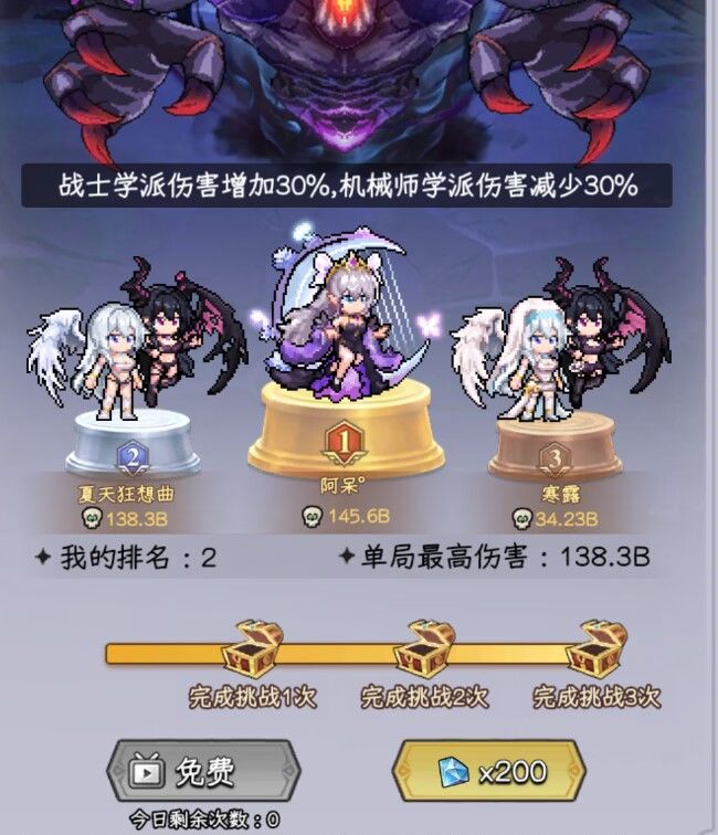 看到有兄弟问低配双子怎么打魔王,我就想给大家分享一下我的打法,希望能有大佬帮我指正一下,圆我一个当第一的梦。 我就是个15天纯萌新,但看的攻略比较多,所以自认为还是有了点理解的。 先说下自己的结论,在我看来有木偶的情况下,双子是完爆花花的,新手的花花最多两命,双子哪怕一命都可以,这也是我试过后得出的结论。 接下来说打法,我是四命双子,刚玩15天的微氪能打个100b自我感觉还行,我就干不过一个大氪佬