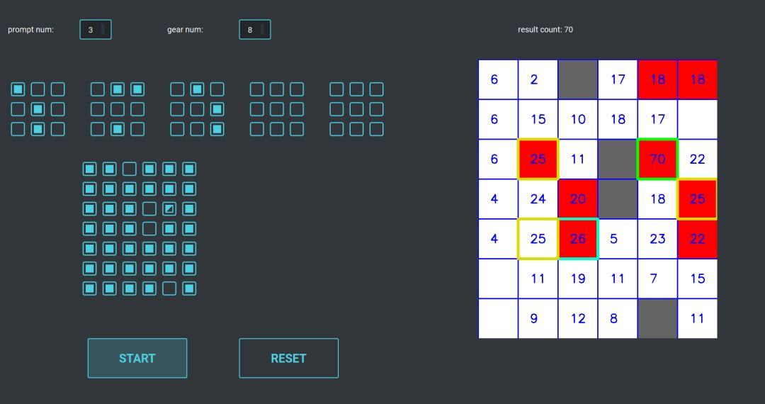 直接上链接: 链接国内速度慢,打不开的自行百度github镜像。 prompt num后面输入提示数量,gear num后面输入齿轮数量,点选提示位置和砖块位置,砖块位置有三种状态(选中,半选中,未选),选中代表是砖块,半选中代表是齿轮,未选代表是空地,右边出现的数字是这个位置所有可能结果叠加的数量,最高的三种用绿色、青色和黄色框选,优先点击最高的砖块可快速降低结果的数量,红色区域是理论计算上出现
