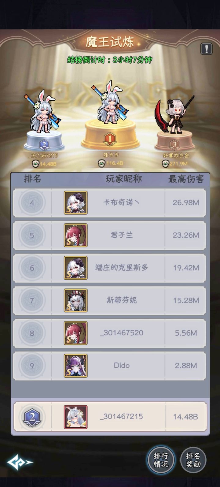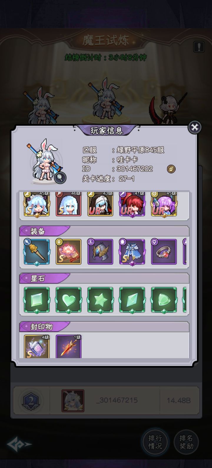 如图,榜一是2级兔子,我是第二,9级兔子,配置差不多,他的书是金色,我的是紫色,打下来伤害差了十倍。我选的羁绊翻倍,20选的共鸣,40高能子弹,60献祭。#勇闯女巫塔 #勇闯女巫塔打法 #勇闯女巫塔创作征集