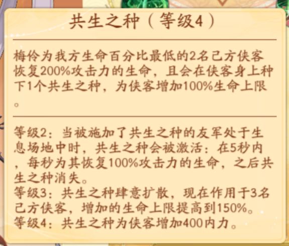 大家好,我是小师妹的好师兄。今天就给大家带来最新的阳系辅助卡——梅伶的测评及养成攻略,希望能对大家有帮助。 一、技能分析: 大招:共生之种。给友方回复生命的同时还能增加巨额的生命上限,而且还能回复大量的内力。非常朴实无华但好用到飞起的大招,而且作用效果可以作用于自身,自身放大给自身回内再继续放大给自身回内,可以说形成了永动。算是天师大招的超级加强版。 二技能:寄生之种。与大招的共生之