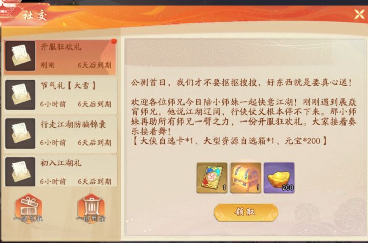 欢迎各位师兄今日陪小师妹一起快意江湖!刚刚遇到展焱宵师兄,他说江湖辽阔,行侠仗义根本停不下来!那小师妹再助所有师兄一臂之力,一份开服狂欢礼:大侠自选卡*1、大型资源自选箱*1、元宝*200大家接着奏乐接着舞!#游戏安利#游戏推荐#游戏讨论#游戏福利#游戏资讯