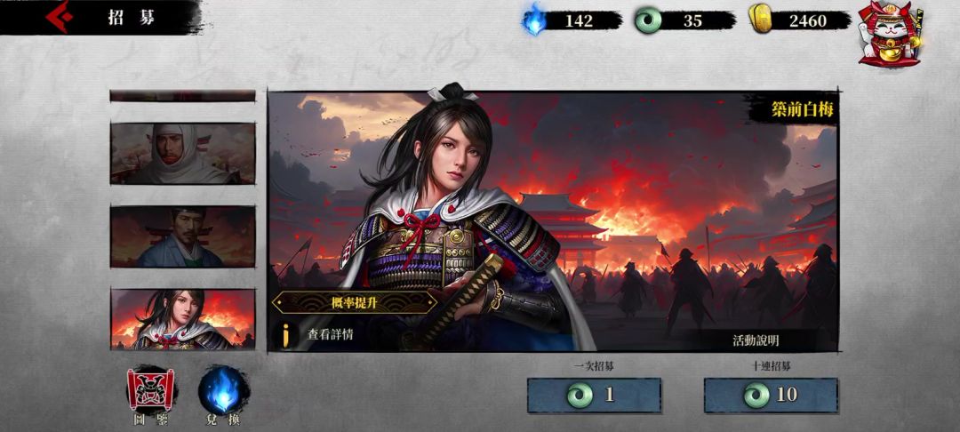 铃木重秀(五星)两星就可以了 不过四星更好 天下布武四件 两件也可以(刀和甲) 抱式大筒(18级)10级应该就可以了 村上武吉(四星)随便带的 抗伤的 赤备枪(17级)抗血用的 10级即可 直江兼续(两星) 随便带一个 远程的 岛津义津(5星)最好3星 大盾铁炮(10级) 佐佐成政(5星) 最好5星 骑兵队(8级) 百万一心二件套 武田信赖(4星)1-2星可 随便一个 注意之处 boss在1 4