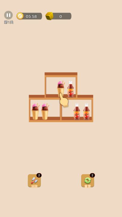 1. 在货架上匹配3样相同的物品,如果可以找到3样相同的物品,并放置在同一个货架上,则这一组3个物品就可以消除!必须要注意的是,必须将货架上前一层的物品全部消除,或者移走后,货架后排的物品才会出现,并且可以点击操作。
