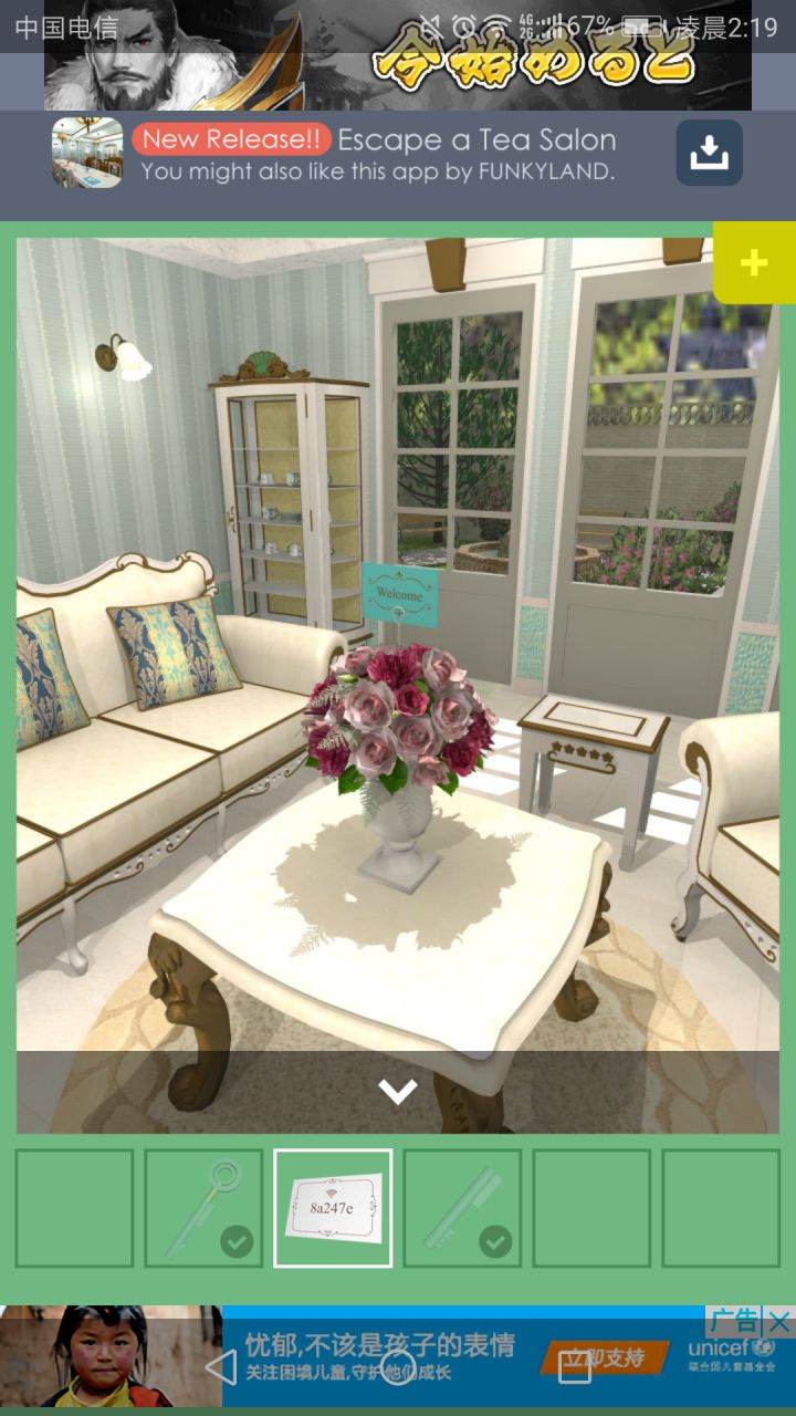 首先点击桌子,得到卡片一张注意左边的柜子里茶杯摆放进入右侧房间,点击左侧墙上的画,点击图中建筑物,颠倒成与柜子里的茶杯一样的摆放,得到钥匙。钥匙可打开放置茶杯的柜子,点击中间的盘子,得到一根小铁管。点击最下方的盒子,得到Wi-Fi密码。点击钥匙再点击铁管,组成新钥匙,新钥匙可打开左侧的门,进入厕所。注意洗手台左侧的置物架上有一个盒子,需要解锁。进入右侧淋浴间,点击墙上装饰物。瓶子图案