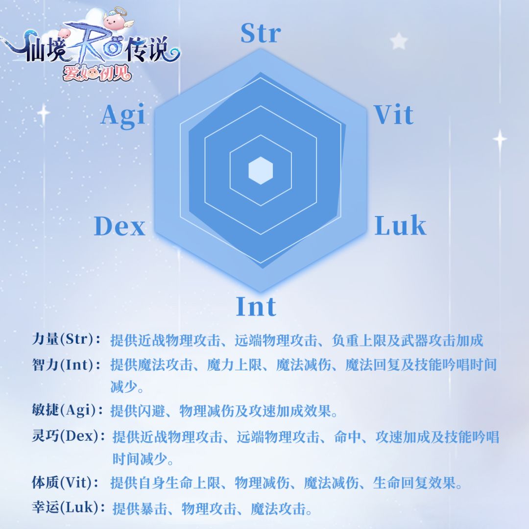 大家好,我是职员卡普拉,今天要来向各位冒险者们介绍角色养成中最重要的一环-「属性值加点」。 在游戏中,总共有六大属性,分别是力量(Str)、敏捷(Agi)、体质(Vit)、智力(Int)、灵巧(Dex)和幸运(Luk)。 初心者们在提升Base等级时,能够获得素质点,可以依据自身需求,把获得的素质点自由地分配到这六个属性中,每个属性值的高低将会大大的影响角色的各项能力素质,因此你的个人属性值将会与